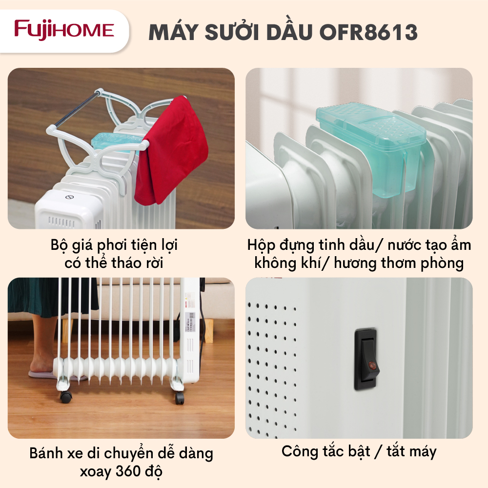 Máy sưởi dầu FUJIHOME OH8613 có thể đặt trong phòng bếp, phòng khách, phòng ngủ phòng đọc sách, vui chơi giải trí, máy được làm nóng bởi các tấm sưởi và tỏa nhiệt độ ra ngoài, nhiệt độ từ lạnh chuyển sang ấm dần, đem đến cảm giác ấm áp và rất dễ chịu.