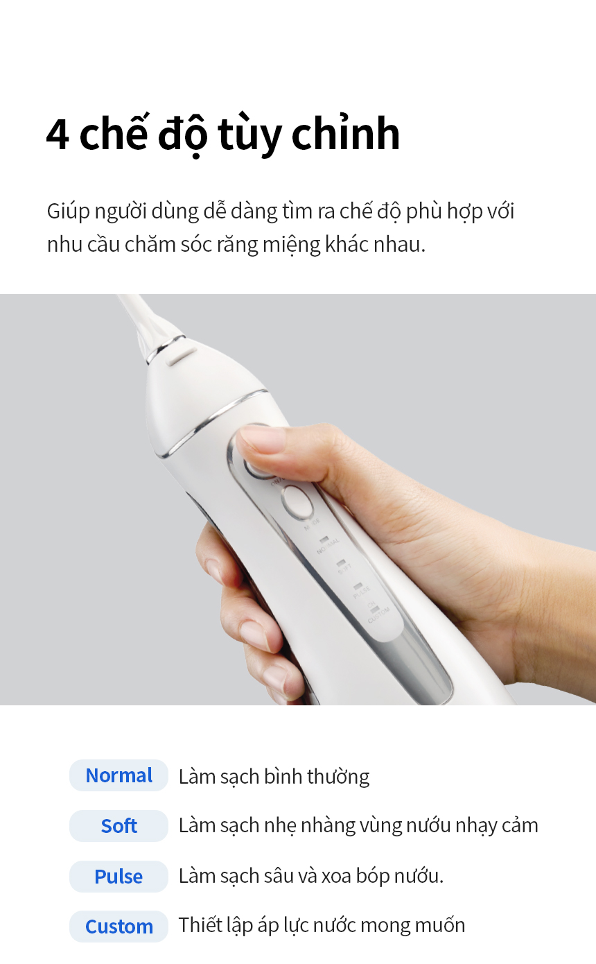 Với 3 loại đầu tăm chuyên dụng, máy phù hợp với tất cả nhu cầu và tình trạng rặng miệng của mỗi người.
