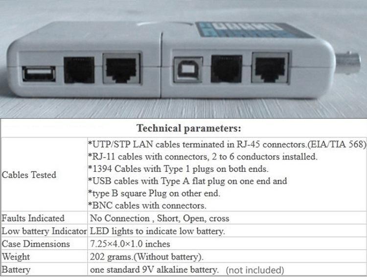 Máy Test mạng đa năng Noyafa NF 3468 Thông số kỹ thuật: Hãng sản xuất: NOYAFA Model: NF-3468 Các tính năng: Các thử nghiệm được bảo vệ (STP) hoặc không được che chở (UTP) LAN lá chắn kiểm tra chuẩn 1394 và cáp USB Thiết kế Ergonomic cầm tay di động rất thuận tiện Kiểm tra cài đặt dây từ xa và cáp nối với độ dài lên đến 600ft (RJ-45 / RJ-11 / BNC) 1 cách đơn giản với mỗi loại cáp truy cập thuận tiện tương ứng bằng 1 pin, Được thiết kế tương ứng với Đèn LED cho biết trạng thái kết nối và cung cấp các lỗi Beeper truyền tin âm thanh giúp cho Kỹ thuật viện dễ dàng xác định lỗi (nếu có) của các thiết bị cần kiểm tra Cáp kiểm tra: UTP / STP cáp LAN chấm dứt trong RJ-45 kết nối (EIA / TIA 568); RJ-11 cáp với đầu nối, 2-6 dẫn cài đặt; 1394 Cáp với Type 1 phích cắm trên cả hai đầu; cáp USB với Type Một plug phẳng trên một đầu và loại B vuông cắm trên đầu kia; dây cáp với đầu nối BNC Lỗi chỉ định: Không có kết nối, ngắn, mở, cross chỉ báo pin thấp: đèn LED để chỉ pin thấp Pin: pin kiềm 9V (không bao gồm)