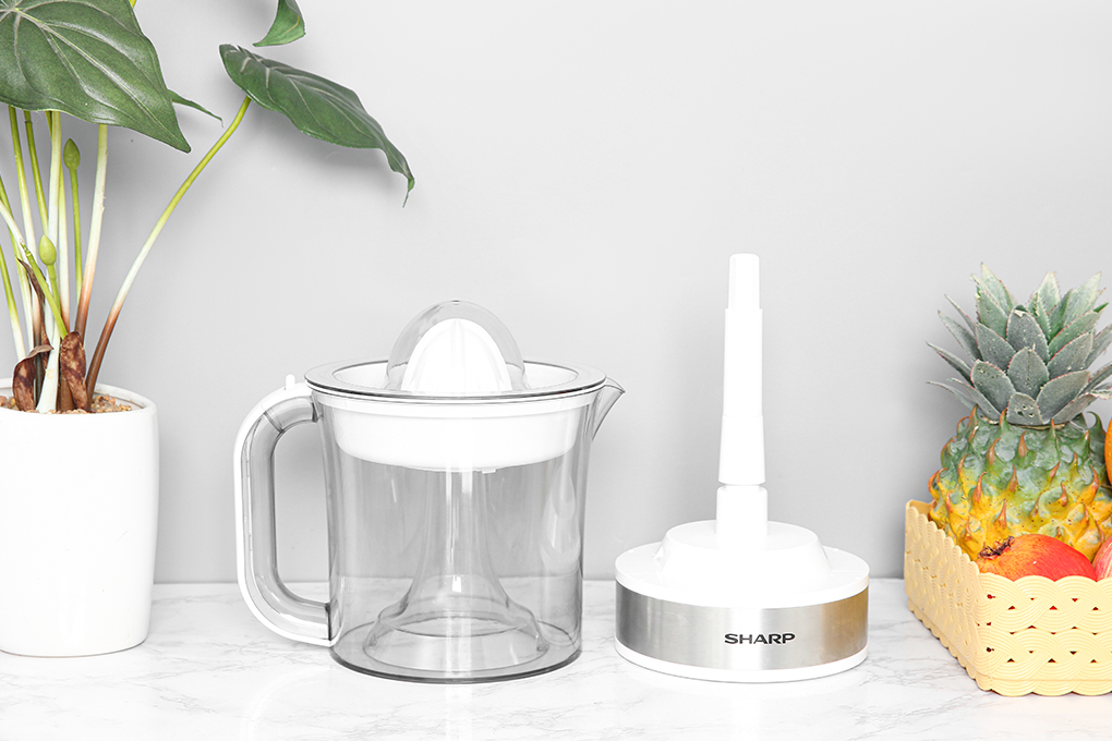 Máy vắt cam Sharp thiết kế gọn nhẹ, màu trắng sáng tươi trẻ, có tay cầm chắc chắn