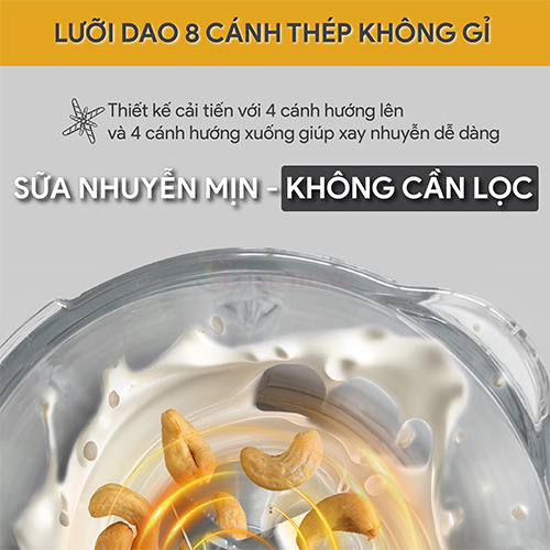 7 chương trình nấu được cài đặt sẵn: sữa đậu nành, sữa bắp, súp, trà, cháo, đun nước, hâm nóng/giữ ấm kết hợp với 3 chương trình xay: sinh tố, sữa lắc, tự làm sạch đa dạng thực đơn chế biến hàng ngày.