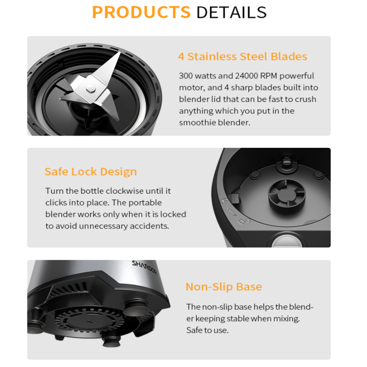 Máy xay sinh tố Shardor PB615B sẽ làm nổi bật không gian bếp nhà bạn với thiết kế bắt mắt và ấn tượng, chất liệu nhựa cao cấp sang trọng, cùng với khả năng xay mạnh mẽ và dễ dàng lau chùi khi sử dụng. Công suất mạnh mẽ lên đến 300W với tốc độ xay 24000 RPM dễ dàng xay nhuyễn các loại trái cây làm thức uống bổ dưỡng. Ngoài ra, bạn cũng có thể dùng máy để xay các loại thực phẩm khác cho gia đình như các loại gia vị hay thực phẩm ăn dặm cho em bé. Ưu điểm của máy xay sinh tố 2 ly Shardor PB615B