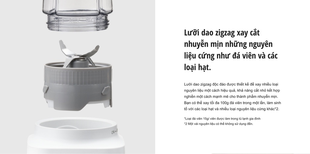 - Lưỡi dao zigzag độc đáo được thiết kế để xay nhiều loại nguyên liệu một cách hiệu quả, khả năng cắt nhỏ kết hợp nghiền một cách mạnh mẽ cho thành phẩm nhuyễn mịn. Bạn có thể xay tối đa 100g đá viên trong một lần, làm sinh tố với các loại hạt và nhiều loại nguyên liệu cứng khác