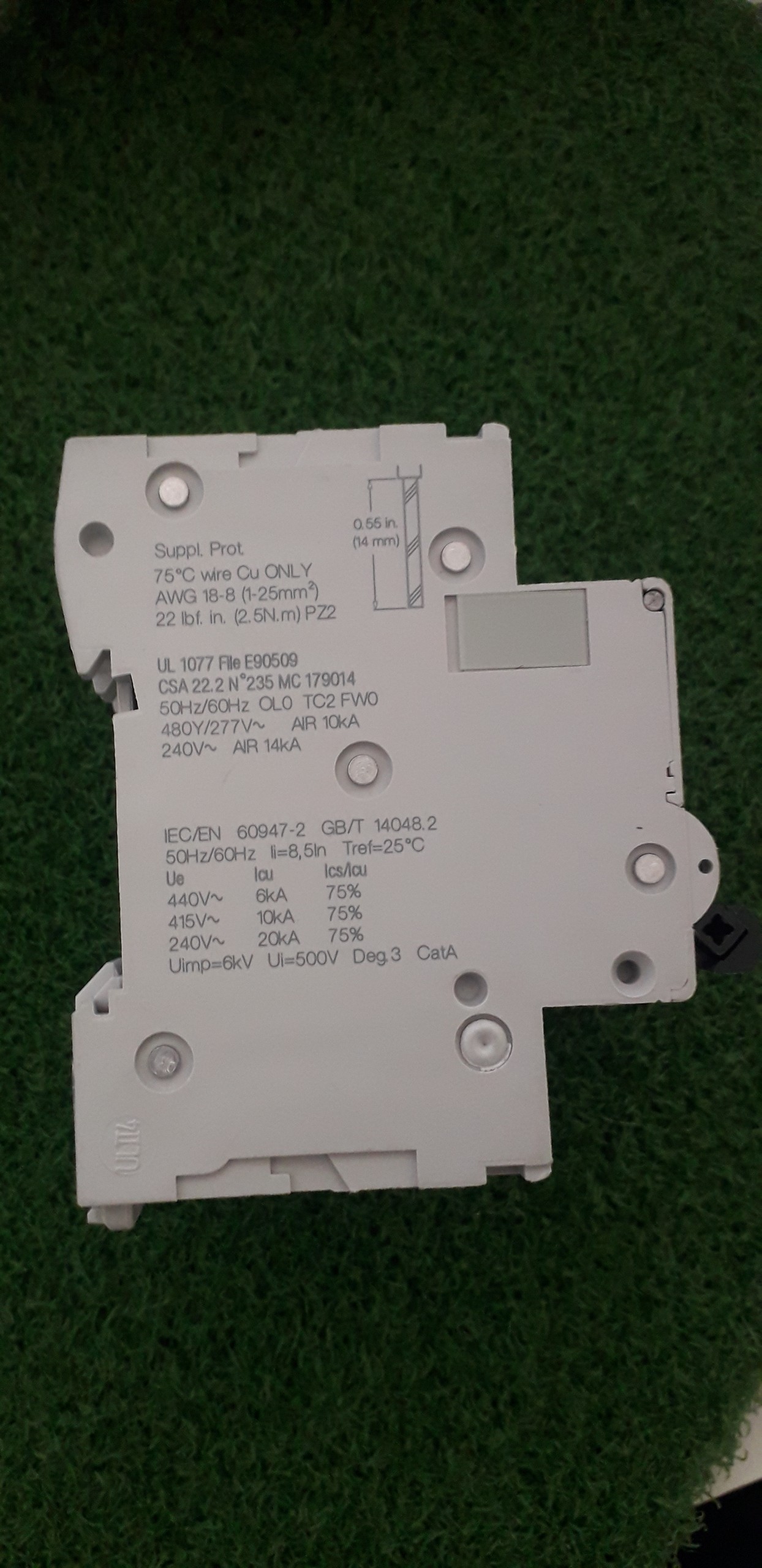 MCB M9F22310 Multi9 C60SP, 3P, 10A, C Curve, 10kA (UL1077), 10kA (IEC/EN 60947-2) Tên sản phẩm: Multi9 C60 Loại sản phẩm hoặc thành phần: Bộ ngắt mạch thu nhỏ Tên viết tắt của thiết bị: C60SP Ứng dụng thiết bị: Phân bổ Mô tả cực: 3P Số cực được bảo vệ: 3 Dòng định mức hiện tại: 10 A 77°F (25°C) EN/IEC 60947-2 Dạng kết nối: AC Công nghệ hoạt động bảo vệ: nhiệt từ Mã đường cong: C Khả năng phá vỡ: 14 kA AIR 240 V AC UL 1077 14 kA AIR 240 V AC CSA C22.2 Số 235 10 kA AIR 480Y/277 V AC UL 1077 10 kA AIR 480Y/277 V AC CSA C22.2 Số 235 6 kA Icu 440 V AC EN/IEC 60947-2 10 kA Icu 415 V AC EN/IEC 60947-2 20 kA Icu 240 V AC EN/IEC 60947-2 6 kA Icu 440 V AC GB 14048.2 10 kA Icu 415 V AC GB 14048.2 20 kA Icu : 3.19 in (81 mm) Width: 2.13 in (54 mm) Depth: 2.83 in (72 mm)