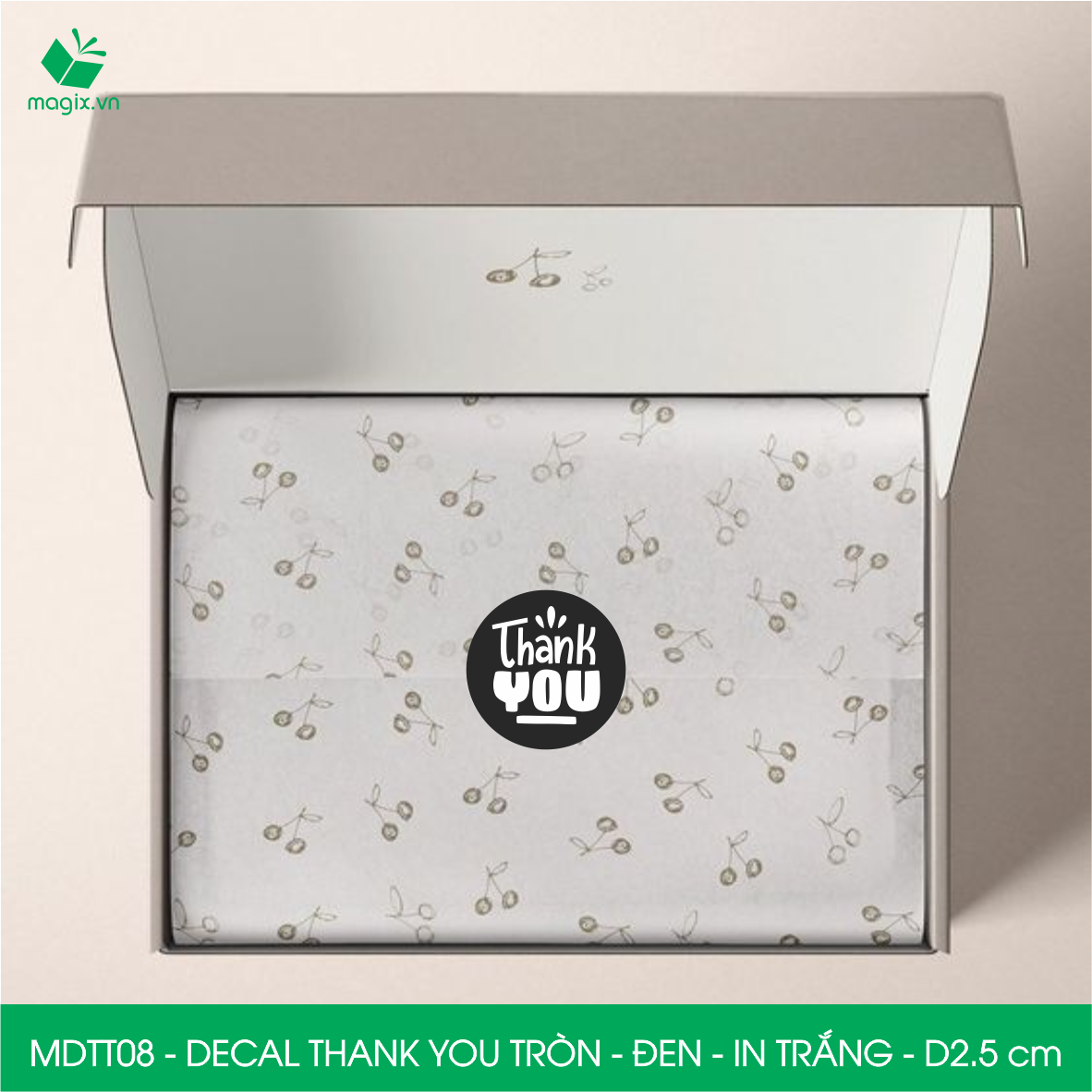 Decal - sticker Thank You là loại nhãn dán có nội dung "Cám ơn" được thiết kế theo hình tròn. Decal Thank You tròn thường được sử dụng để trang trí đóng gói thời trang, quà tặng… để thể hiện sự biết ơn, trân trọng tới người được nhận.   Sticker thank you tròn có nhiều đặc điểm nổi bật như: Kiểu dáng: Có nhiều thiết kế với nhiều hình ảnh, họa tiết hoặc chữ viết khác nhau, từ đơn giản đến cầu kỳ. Dễ dàng lựa chọn mẫu theo mục đích sử dụng. Kích thước: Đường kính: 2.5cm Chất liệu: Decal Thank You được làm từ giấy decal 3 lớp trên bề mặt được phủ thêm 1 lớp màng mờ, tăng khả năng chống thấm nước giúp decal bền hơn. Ngoài ra khi cán thêm lớp màng mờ sẽ giúp món quà trở lên sang trọng và bắt mắt hơn. Công dụng: Dán trên các gói hàng, quà tặng để thể hiện sự biết ơn đối với người nhận Dán trên các sản phẩm, dịch vụ để thể hiện sự trân trọng đối với khách hàng Dán trên các tài liệu, văn bản để thể hiện sự cảm ơn đối với người nhận Dán trên các vật dụng trang trí để tạo điểm nhấn   QUY CÁCH KỸ THUẬT Mã sản phẩm: MDTT Kiểu dáng: Hình tròn Đường kính: 2.5cm Đóng gói: 50 tem/ pack Kích thước đóng gói: 3x15cm Chất liệu: Decal 3 lớp - cán màng Màu sắc: Nhiều màu   LƯU Ý:  Bảo quản sản phẩm nơi khô ráo, sạch sẽ tránh tiếp xúc nơi có ánh sáng mặt trời và khu vực độ ẩm cao.