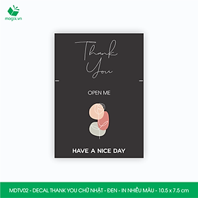 Decal - sticker Thank You là loại nhãn dán có nội dung "Cám ơn" được thiết kế theo hình chữ nhật. Decal Thank You thường được sử dụng để trang trí đóng gói thời trang,