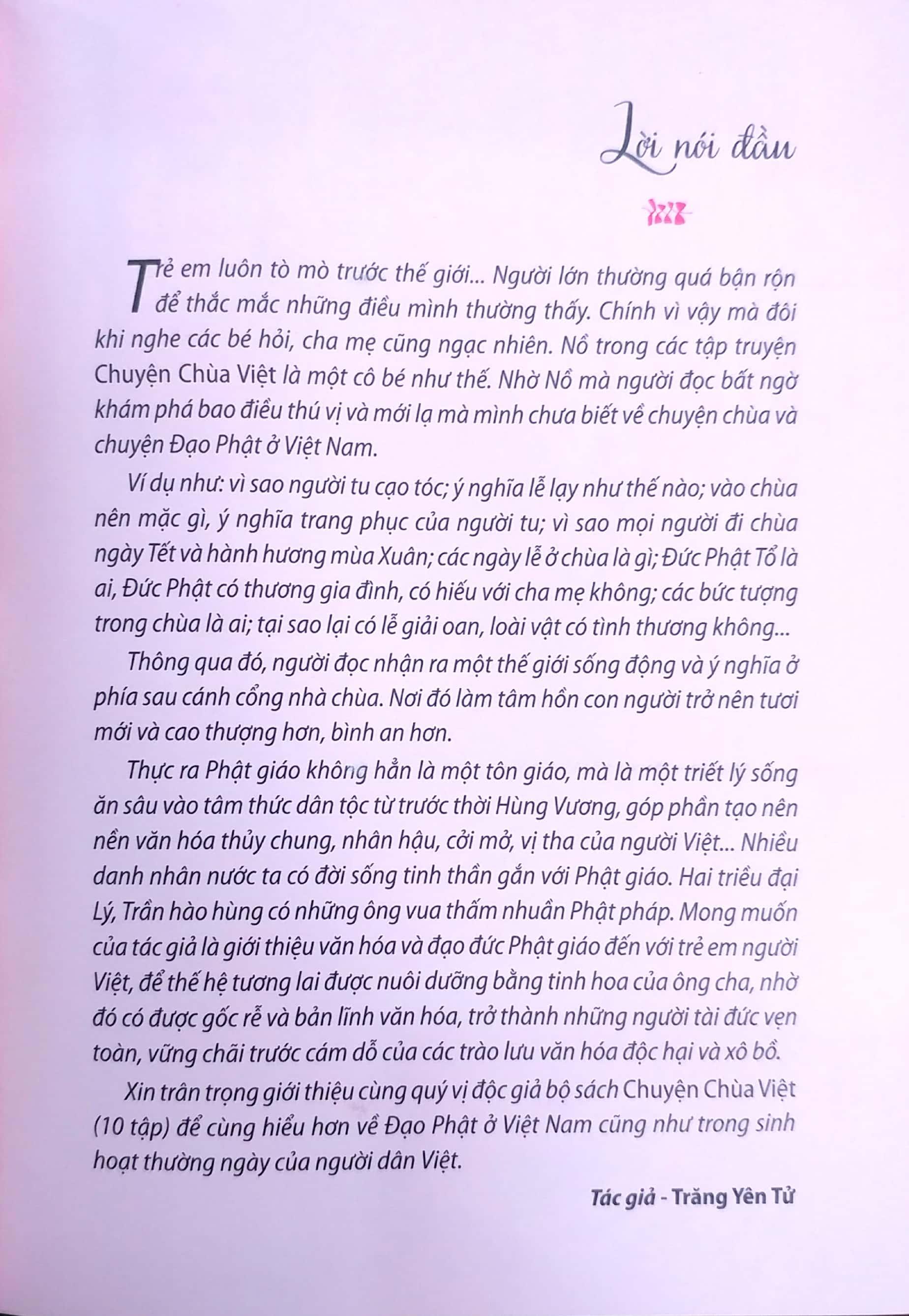 Thực ra Phật giáo không hẳn là một tôn giáo, mà là một triết lý sống ăn sâu vào tâm thức dân tộc từ trước thời Hùng Vương, góp phần tạo nên nền văn hóa thủy chung, nhân hậu, cởi mở, vị tha… Nhiều danh nhân nước ta có đời sống tinh thần gắn với Phật giáo. Hai triều đại Lý Trần hào hùng có những ông vua thấm nhuần Phật pháp. Mong muốn của tác giả là giới thiệu văn hóa và đạo đức Phật giáo đến với trẻ em người Việt, để thế hệ tương lai được nuôi dưỡng bằng tinh hoa của ông cha, nhờ đó có được gốc rễ và bản lĩnh văn hóa, trở thành những người tài đức vẹn toàn, vững chãi trước cám dỗ của các trào lưu văn hóa độc hại và xô bồ”.
