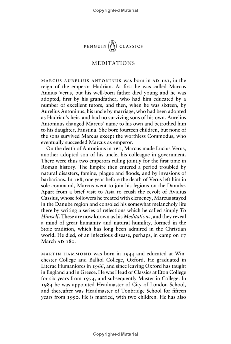 Originally written only for his personal consumption, Marcus Aurelius's Meditations has become a key text in the understanding of Roman Stoic philosophy. This Penguin Classics edition is translated with notes by Martin Hammond and an introduction by