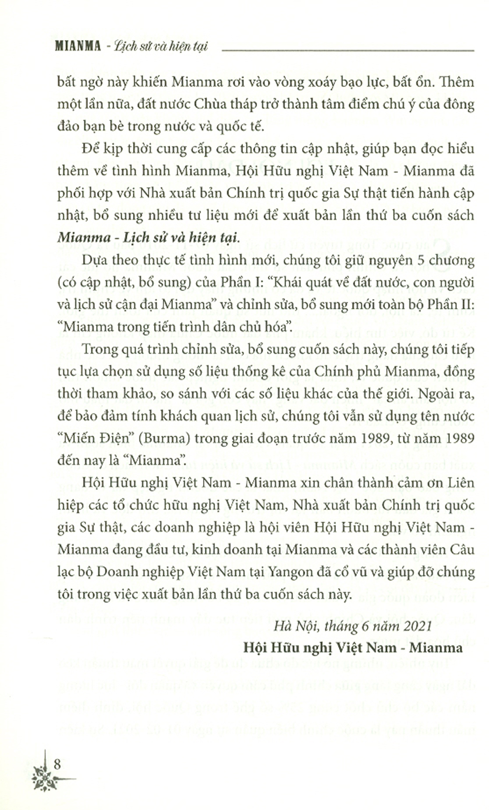 Tuy nhiên, thông tin khách quan và chính xác về lịch sử phát triển, đất nước, con người, chế độ chính trị, văn hóa, phong tục tập quán của đất nước Mianma vẫn là một ẩn số đối với nhiều người Việt Nam quan tâm đến quốc gia Đông Nam Á này. Nhằm giúp bạn đọc có điều kiện nghiên cứu và tìm hiểu sâu hơn về đất nước, con người Mianma, Nhà xuất bản Chính trị quốc gia - Sự thật xuất bản cuốn sách Mianma - Lịch sử và hiện đại do Đại sứ Chu Công Phùng chủ biên. Thông qua cuốn sách, bạn đọc sẽ hiểu biết sâu thêm về con người, lịch sử, chính trị, kinh tế, văn hóa, xã hội, những tiềm năng và thế mạnh của đất nước Mianma, mà trên thực tế có nhiều nét gần gũi, tương đồng với lịch sử, đất nước, con người Việt Nam chúng ta.