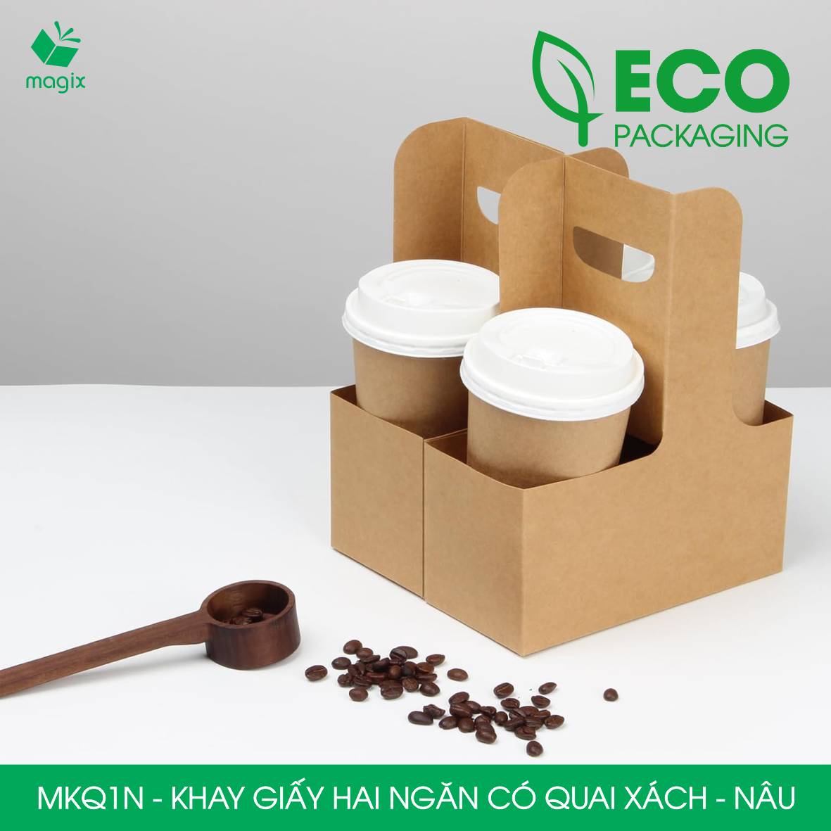 Khay giấy hai ngăn có quai xách - Tiện lợi, an toàn, thân thiện môi trường, được sử dụng phổ biến tại các quán cà phê, nhà hàng, quán ăn, shop bán online…