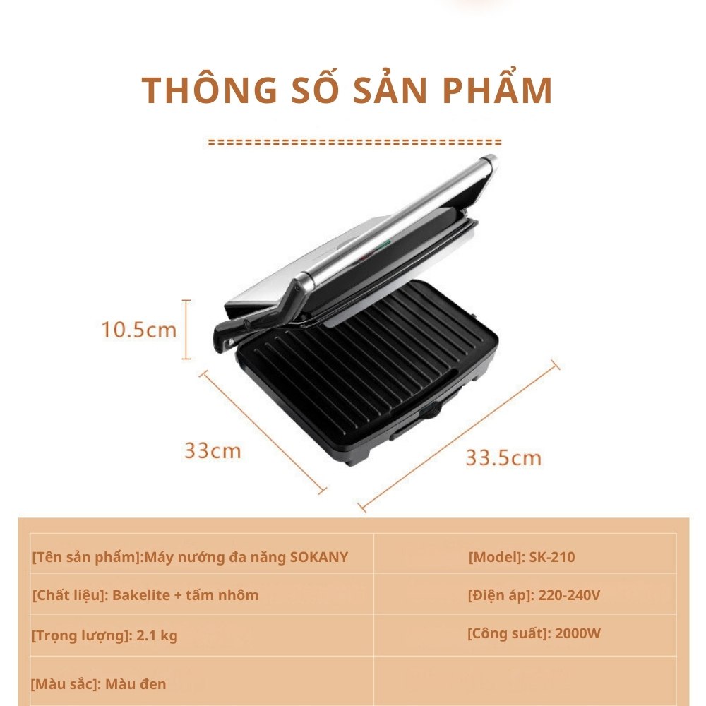 - Máy nướng đa năng Sokany SK-210 là một thiết bị nhà bếp tiện lợi giúp bạn dễ dàng nướng bánh mì, sandwich, thịt, cá, rau củ quả,... Máy có thiết kế nhỏ gọn, hiện đại với màu đen chủ đạo. Tính năng: