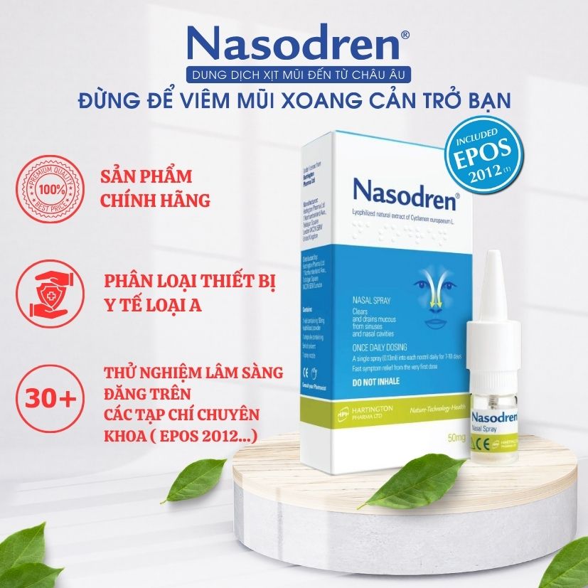 - Nasodren là một loại dung dịch xịt mũi dùng để giúp đưa gỉ và chất nhầy ra ngoài, đồng thời làm sạch mũi và xoang. Sử dụng để giảm các triệu chứng của viêm xoang cấp tính và viêm xoang mãn tính.