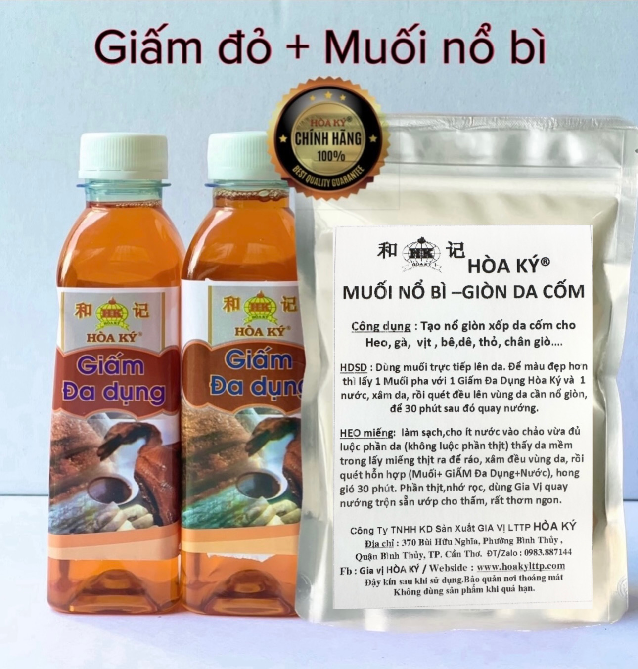ombo quay nướng đầy đủ gia vị, không cần nêm thêm. Gồm có : Muối nổ bì giòn da cốm Gia vị trộn sẵn ướp phần thịt Giấm (Dấm) đa dụng tạo màu đẹp ,da giòn . Thực phẩm : cho Heo, gà,  vịt , bê,dê, thỏ, chân giò, chim bồ câu ….tạo nổ giòn xốp da cốm, thịt thấm vừa ăn thơm ngon.   MUỐI NỔ BÌ - GIÒN DA CỐM   Công dụng : Tạo nổ giòn xốp da cốm cho Heo, gà,  vịt , bê,dê, thỏ, chân giò.... HDSD : Dùng muối trực tiếp lên da. Để màu đẹp hơn thì lấy  Muối nổ pha với  Giấm Đa Dụng Hòa Ký , xâm đều bề mặt da, rồi quét đều vùng da cần nổ giòn, để 30phút – 1 tiếng ( tùy miếng thịt nhỏ lớn), sau đó quay nướng. Lưu Ý : Tùy kích thước miếng thịt mà chúng ta chọn nhiệt độ lò và thời gian quay cho phù hợp .   HEO miếng:  làm sạch,cho ít nước vào chảo vừa đủ luộc phần da (không luộc phần thịt) thấy da mềm trong,  lấy miếng thịt ra để ráo, xâm đều vùng da, rồi quét hỗn hợp (Muối nổ + GiẤM Đa Dụng), hong gió 30 phút – 1 tiếng. Phần thịt,nhớ rọc, dùng Gia Vị quay nướng trộn sẵn ướp cho thấm, rất thơm ngon.   Dùng gia vị ít hay nhiều đều được ( tuỳ khẩu vị) . Dùng được cho món Chay.