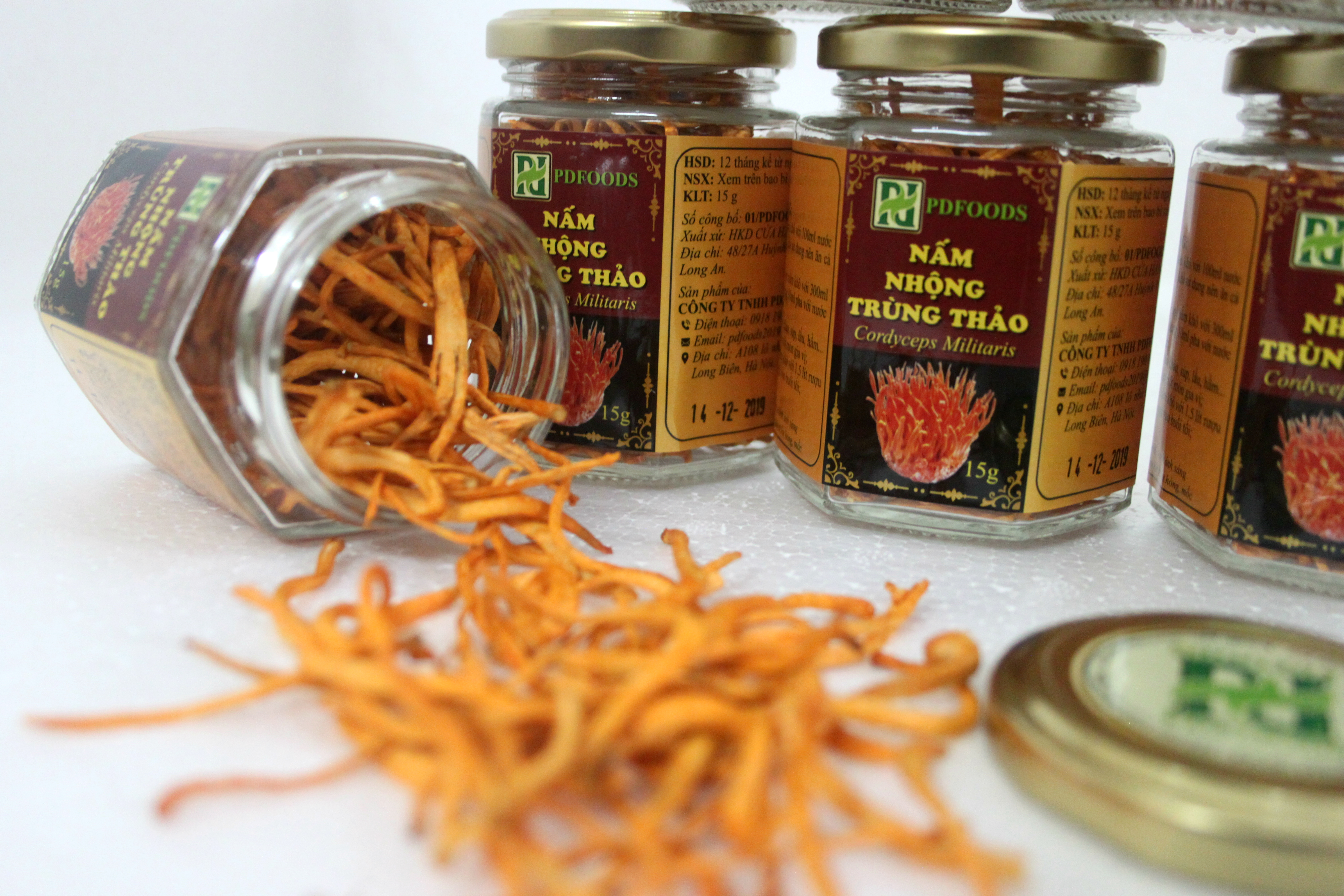 Sản phẩm nấm nhộng trùng thảo PDFoods được nuôi trồng hữu cơ. Thông tin cơ bản của sản phẩm: - Tên sản phẩm: Nấm nhộng trùng thảo Cordyceps militaris - Hình thức sản phẩm: sấy