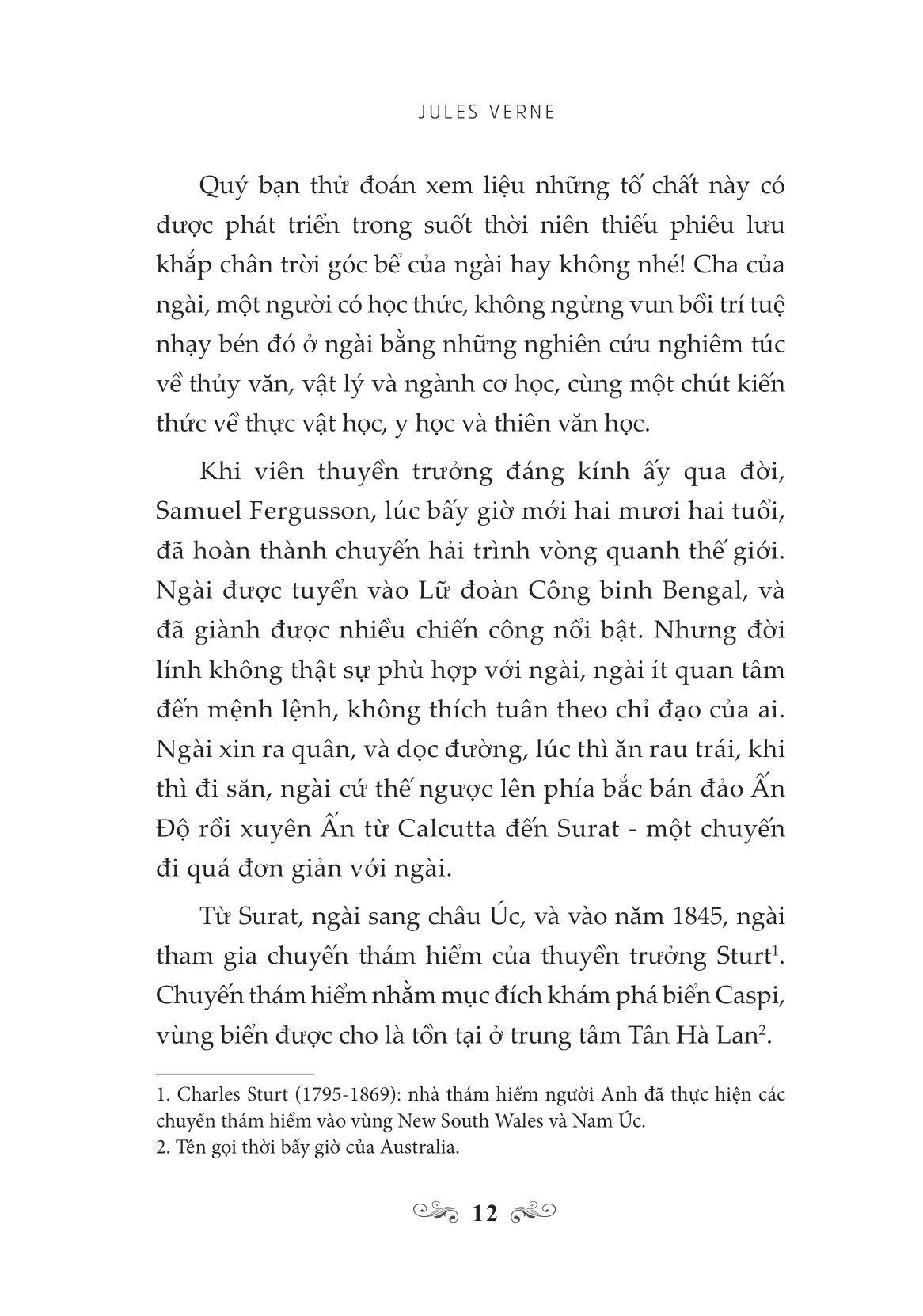 “Về chuyện trở ngại,” Fergusson nghiêm giọng nói. “Trở ngại tồn tại là để ta vượt qua. Còn rủi ro và nguy hiểm ư? Ai dám tự vỗ ngực tuyên bố ta đây chẳng bao giờ gặp nguy? Chúng ta chỉ nên thấy hiện tại qua tương lai mà thôi, vì tương lai chẳng qua chỉ là hiện tại xa hơn một chút.”