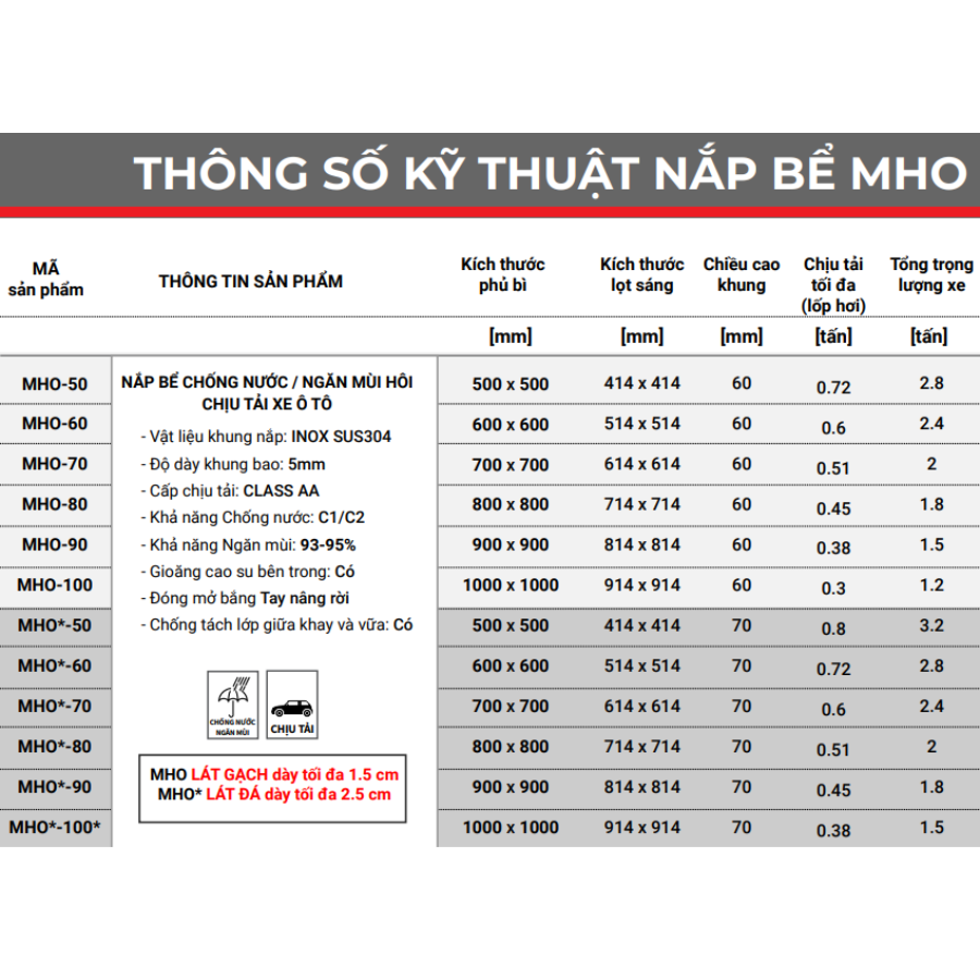 Cấp chịu tải CLASS A (ZAVAK): 0.51 tấn/nắp, chịu tải cho xe 2 tấn.