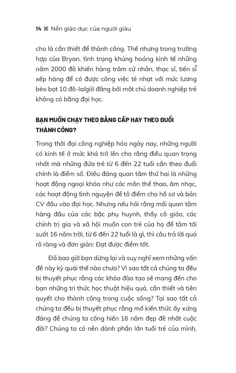 Bạn sẽ thấy được điều đó khi đọc Nền Giáo Dục Của Người Giàu của Michael Ellsberg. Tác giả đã phỏng vấn các tỉ phú và triệu phú không có bằng đại học như ông trùm thời trang Russell Simmons. Bên cạnh đó, Michael Ellsberg còn đưa ra những chỉ dẫn tuyệt vời để bạn tiến tới thành công bằng những kỹ năng vô cùng đơn giản: Để tìm được người hướng dẫn, cách tạo hứng thú trong công việc, cách xây dựng phong cách cá nhân và nhiều hơn thế nữa.