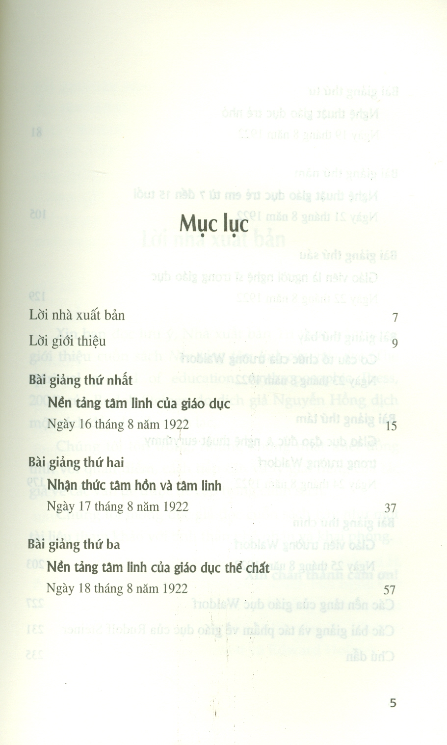 - Tác phẩm Nền tảng tâm linh của giáo dục là một trong những bài giảng xuất sắc của Rudolf Steiner về phương pháp giáo dục Waldorf vì có cái nhìn rộng rãi, sâu sắc, táo bạo và có khả năng tiếp cận cao. Bài giảng được đưa ra năm 1922 tại Đại học Mansfield, Oxford, Anh và thính giả là những người danh tiếng nhất mà Steiner từng thuyết giảng. Đó là hội nghị về “Giá trị tâm linh trong giáo dục và đời sống xã hội” với khoảng 200 người tham dự. Tiến sĩ Millicent Mackenzie, sau này là Giáo sư Giáo dục tại thành phố Cardiff (Wales) - người mà Steiner rất kính trọng - giữ vai trò chủ tọa trong các bài giảng. Bộ trưởng Bộ Lao động, Tiến sĩ H. A. L. Fisher chịu trách nhiệm điều khiển Hội nghị. Các diễn giả khác là những tên tuổi nổi tiếng như học giả cổ điển vĩ đại Gilbert Murray, nhà văn A. Clutton Brock, Giáo sư Maxwell Garnett và Edward Holmes. “Giáo viên cần có tâm trí cởi mở, sẵn sàng đón nhận kiến thức mới mỗi ngày và khuynh hướng có thể biến đổi tri thức tích lũy thành tiềm lực giúp tâm trí luôn rộng mở đón nhận cái mới. Điều này giúp con người khỏe mạnh, trẻ trung và năng động. Một trái tim cởi mở đón nhận những thay đổi trong cuộc sống - sự mới mẻ bất ngờ và tiếp diễn của cuộc sống - phải là bản chất và tâm tính cơ bản của một giáo viên trường Waldorf”.