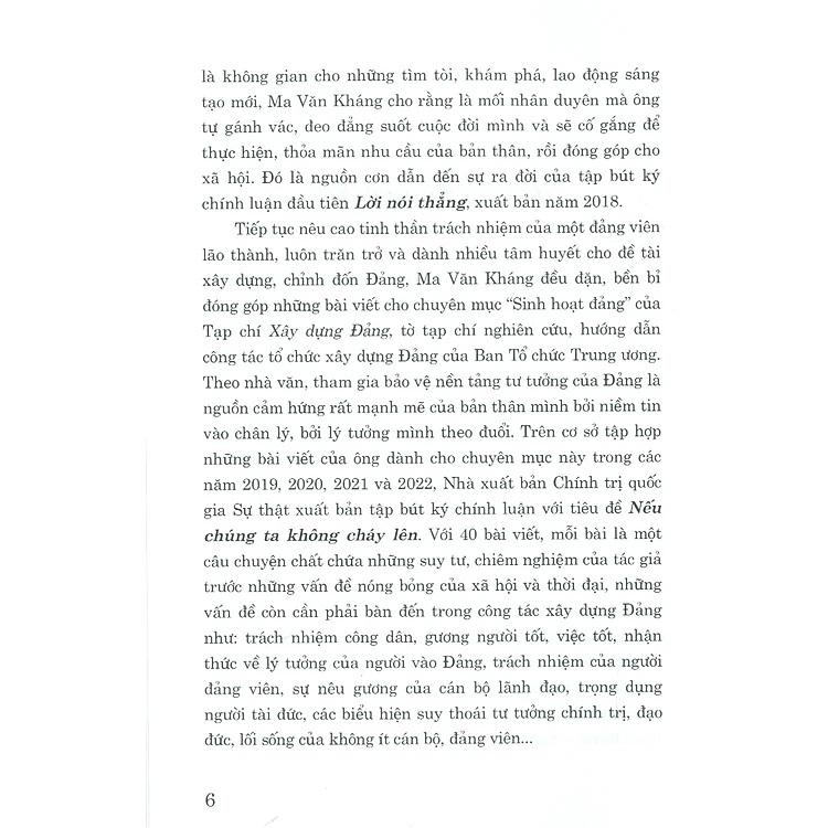 Với 40 bài viết, mỗi bài là một câu chuyện chất chứa những suy tư, chiêm nghiệm của tác giả trước những vấn đề nóng bỏng của xã hội và thời đại, những vấn đề còn cần phải bàn đến trong công tác xây dựng Đảng như: trách nhiệm công dân, gương người tốt, việt tốt, nhận thức về lý tưởng của người vào Đảng, trách nhiệm của người đảng viên, sự nêu gương của cán bộ lãnh đạo, trọng dụng người tài đức, các biểu hiện suy thoái tư tưởng chính trị, đạo đức, lối sống của không ít cán bộ, đảng viên…