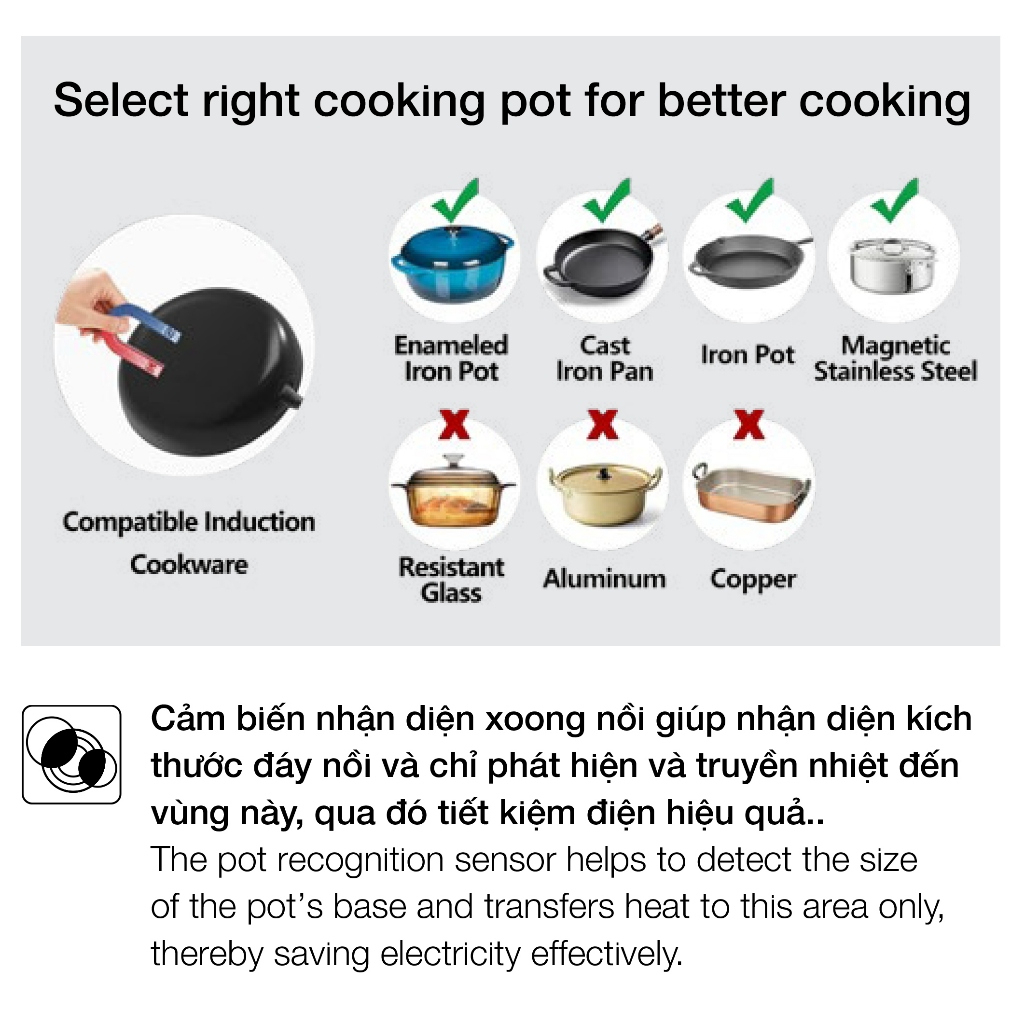 Chức năng giữ ấm với 3 mức nhiệt 45 độ C / 65 độ C / 85 độ C, phù hợp với các món ninh, hầm,… Cảm biến nhận diện xoong nồi giúp nhận diện kích thước đáy nồi và chỉ phát hiện và truyền nhiệt đến vùng này, qua đó tiết kiệm điện hiệu quả.