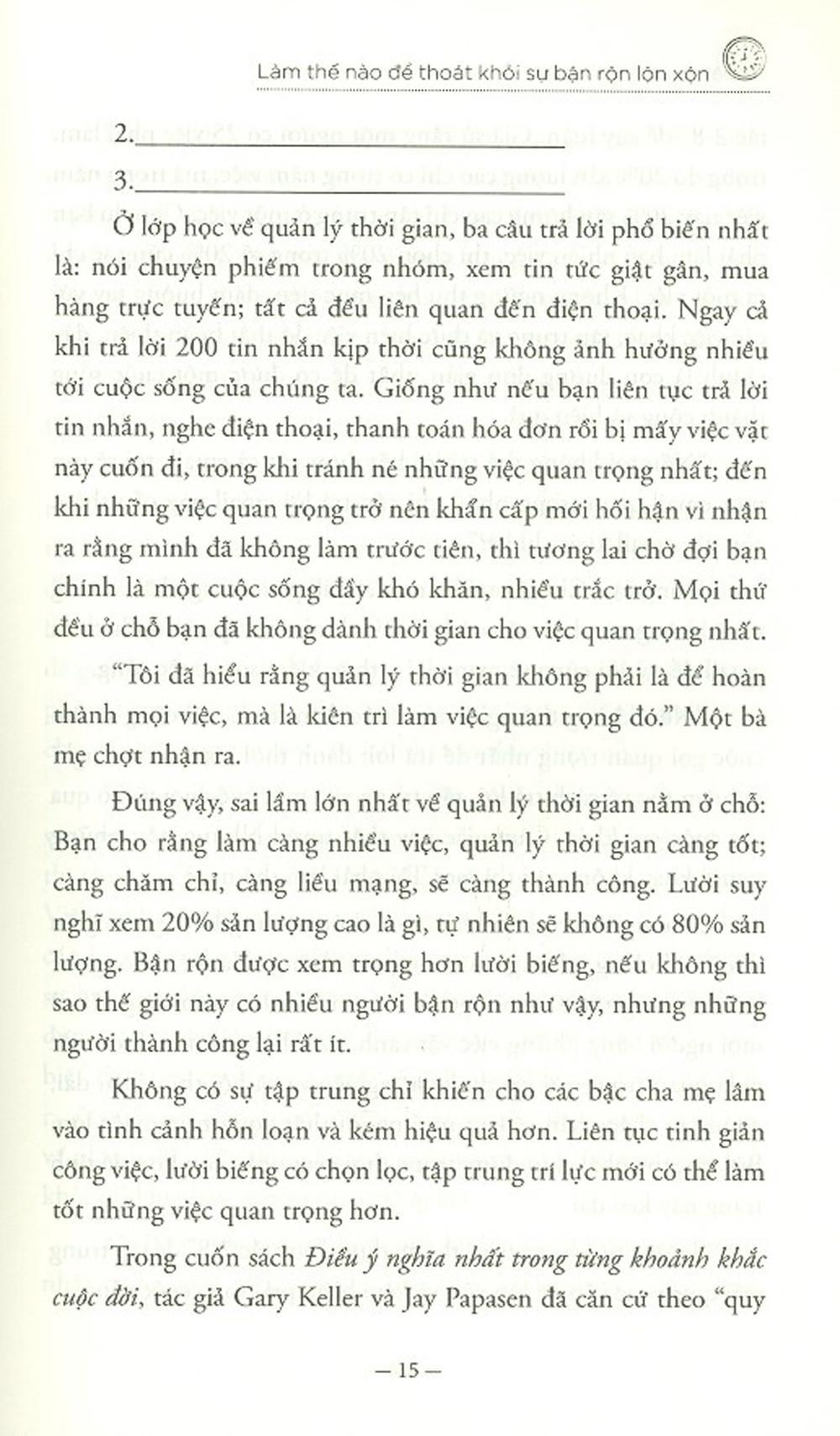 Quản lý thời gian là quản lý cảm xúc, năng lượng, là quản lý cuộc sống, cuộc đời của mình với những công việc khi có thêm một sinh linh mới khiến ta trở thành cha mẹ. Cuốn Nghệ thuật quản lý thời gian của cha mẹ sẽ giúp chúng ta hiểu thêm về nghệ thuật làm cha mẹ, nghệ thuật sống, và nhiều triết lý nhân sinh sâu sắc. Làm cha mẹ là sống thêm một cuộc đời nữa, một lần trẻ thơ nữa và là cách những người có mong muốn làm cha mẹ trưởng thành thêm khi có con.