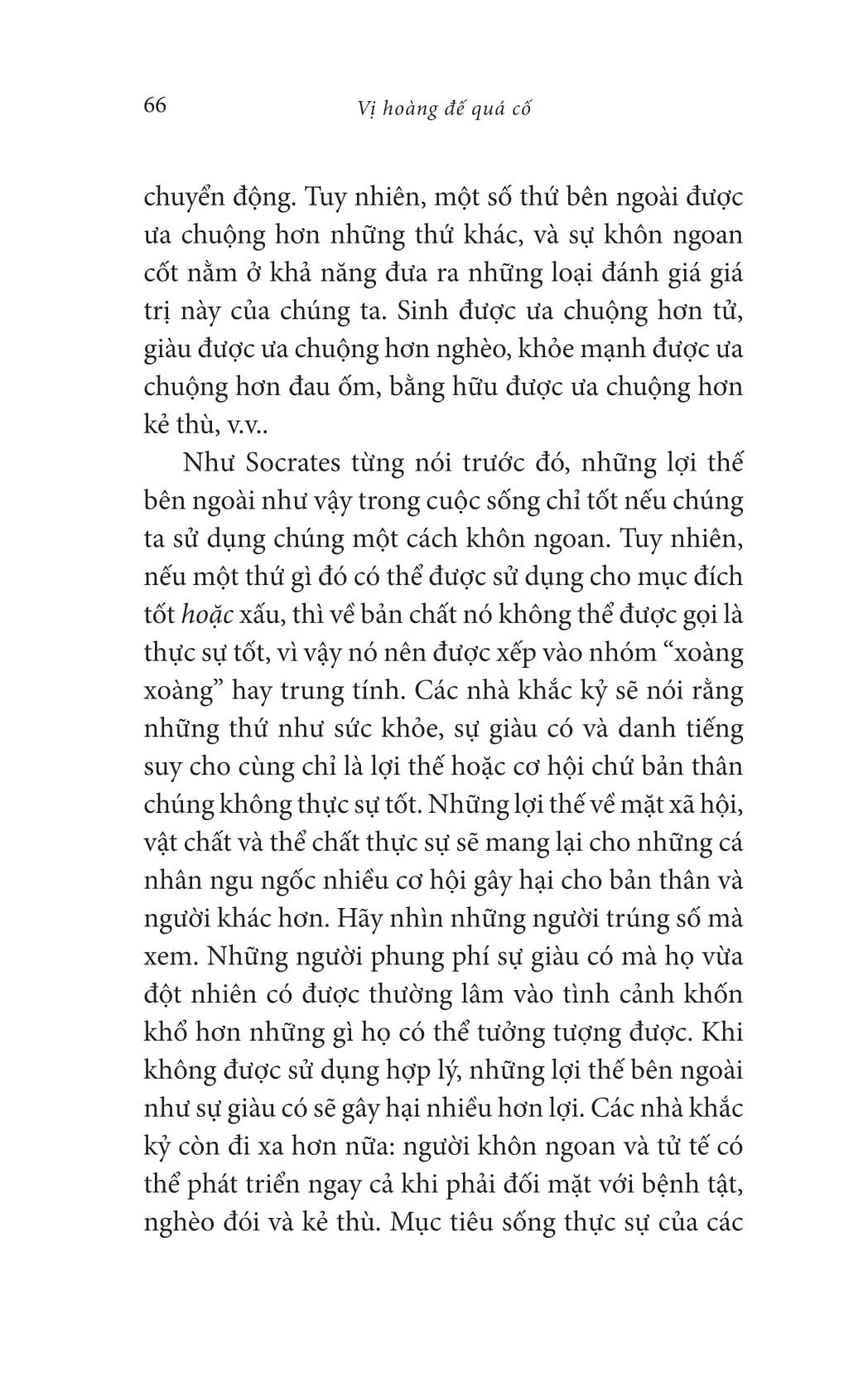Các nhà khắc kỷ có thể dạy cho bạn cách tìm ra chí hướng trong cuộc sống, cách đối mặt với nghịch cảnh, cách chế ngự cơn giận dữ nội tại, tiết chế ham muốn, trải nghiệm những nguồn vui lành mạnh, kiên nhẫn chịu đựng nỗi đau và bệnh tật một cách đầy tự tôn, tỏ ra can đảm khi đối mặt với lo lắng, đối phó với sự mất mát, và thậm chí có thể đối mặt với sự sống hữu hạn của con người trong khi vẫn bình thản, như Socrates. Marcus Aurelius phải đối mặt với những thách thức khổng lồ trong thời gian trị vì đế chế La Mã. Tôi muốn mời bạn, với tư cách là một độc giả, cố gắng đọc cuốn sách này theo một cách đặc biệt, thử đặt mình vào vị trí của Marcus và nhìn cuộc sống qua đôi mắt ông, qua lăng kính triết lý của ông. Hãy cùng xem chúng ta có thể đồng hành cùng ông trong chuyến hành trình của ông để qua từng ngày tự biến mình thành một nhà khắc kỷ đầy bản lĩnh hay không. Nếu Số phận cho phép, có lẽ sẽ có nhiều người hơn có thể áp dụng sự khôn ngoan của chủ nghĩa khắc kỷ vào những thách thức thực sự và những vấn đề hằng ngày của cuộc sống hiện đại. Tuy nhiên, sự thay đổi đó sẽ không dễ xảy ra. Nó chỉ xảy ra khi chúng ta đưa ra một quyết định chắc chắn rằng, ở đây và ngay bây giờ, chúng ta sẽ bắt đầu áp dụng những ý tưởng như thế vào thực tế. Như Marcus đã viết cho chính mình: Đừng lãng phí thời gian tranh luận về việc một người tốt nên như thế nào; hãy là một người tốt.