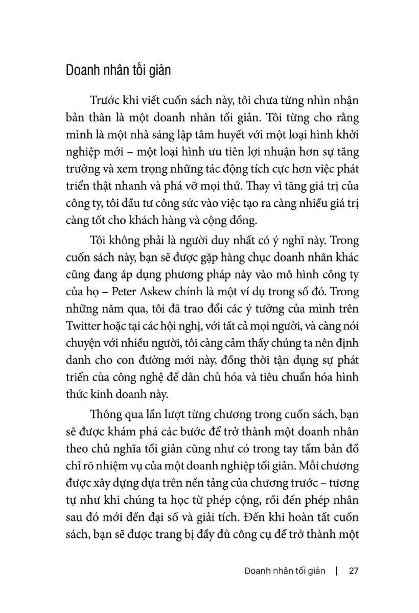 Trong lịch sử, các doanh nhân đóng một vai trò quan trọng trong việc thúc đẩy tiến bộ công nghệ và xã hội. Và ngày nay thì việc này càng được xem trọng hơn, khi luật pháp yêu cầu các tập đoàn lớn phải ưu tiên lợi ích của cổ đông hơn là giá trị mà công ty tạo ra. Trong quá trình viết The Minimalist Entrepreneur: How Great Founders Do More With Less, tác giả đã nghiên cứu vô số ví dụ về các doanh nghiệp như Basecamp, Wistia, Missouri Star Quilt Company và nhiều công ty thẳng-và-thật khác – những công ty với tiềm năng phát triển cực kỳ cao đang tập trung giải quyết các vấn đề thực sự thông qua các sản phẩm, dịch vụ và các ứng dụng hữu ích được công chúng đón nhận; đồng thời vẫn mang về lợi nhuận đủ để nuôi sống công ty.