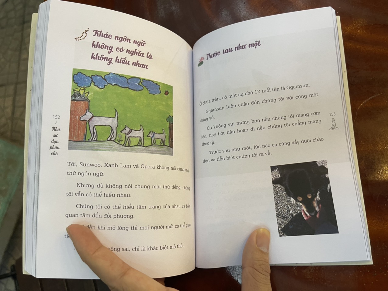 Một bé bốn tuổi vẫn còn đi chưa vững, lấy đá ném vào chú chó bé nhỏ hơn mình. Tại sao bé lại làm như vậy? Bên cạnh, một bé khác lên tiếng ngăn cản bạn. Vậy lúc đó, em bé này đã nghĩ sao? Một bé vốn nghĩ chó chỉ là loài động vật hôi hám, ánh mắt chợt sáng lấp lánh khi nhìn thấy các bạn chó làm việc cho con người. Bé ấy đã cảm thấy điều gì nhỉ? Một bé mỉm cười rạng rỡ khi vuốt ve bộ lông mềm mượt của một chú chó dẫn đường. Tôi thành thật hy vọng các bé có thể trưởng thành và tỏa sáng trong mỗi phút giây như vậy. Đồng hành cùng tôi và các bé là ba chú chó trắng, chó dẫn đường, chó nghiệp vụ của trang trại sản xuất thực phẩm cho chó và cha mẹ, ông bà của các bé – những người đang hoan nghênh, cổ vũ các em cũng như nỗ lực của các cô giáo ở trường mầm non. Tôi có chút e ngại vì sợ năng lực viết nghèo nàn của mình không thể nào truyền tải được toàn bộ những câu chuyện tuyệt vời về trẻ em và động vật. Dù vậy, tôi vẫn hy vọng bạn đọc có thể bỏ qua những thành kiến sẵn có về sách do nhà sư viết, và cảm nhận trọn vẹn tâm hồn đẹp đẽ của trẻ em cũng như sự đáng yêu của những người bạn bốn chân thông qua cuốn sách này.