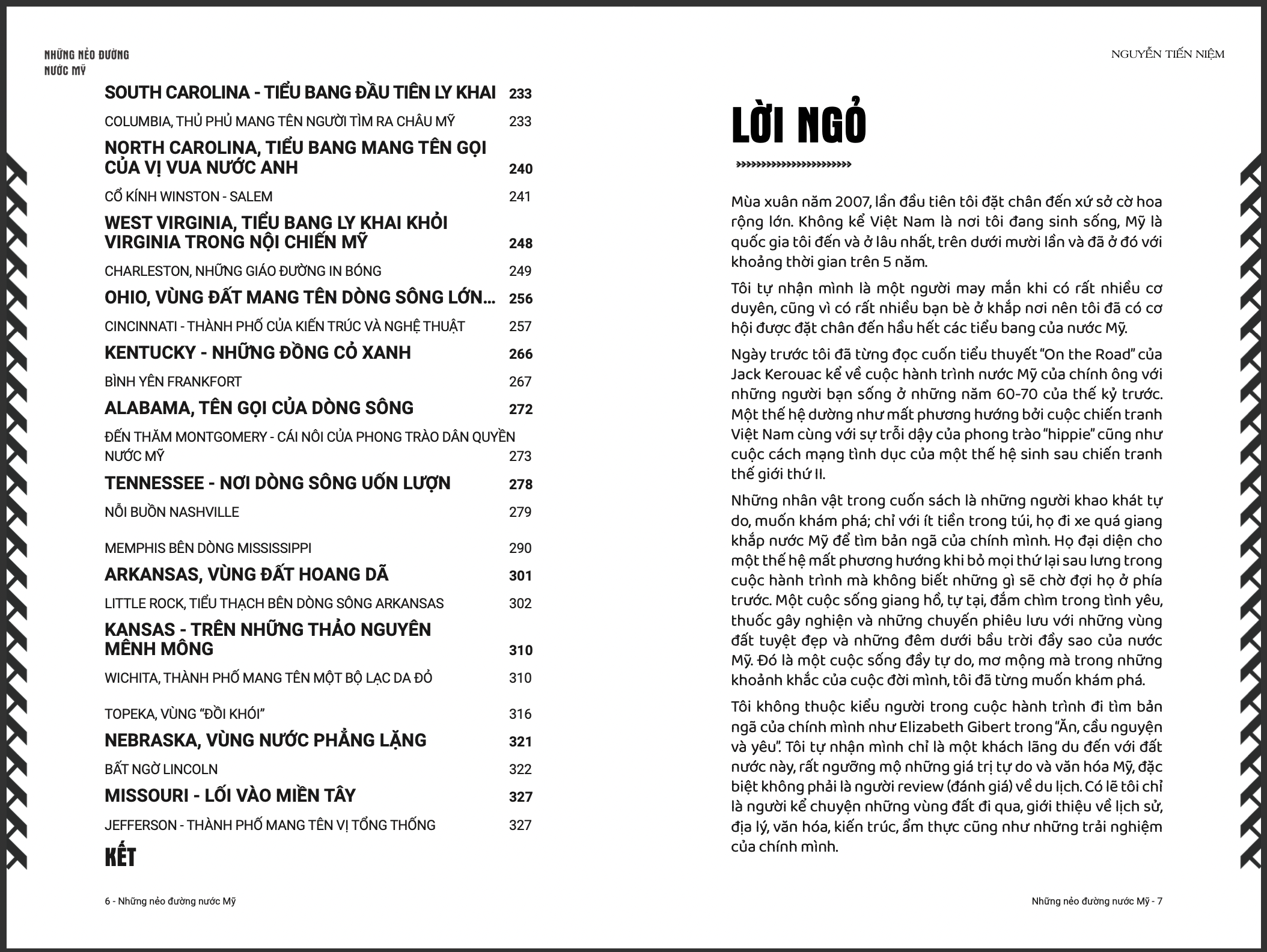 “Tôi không thuộc kiểu người trong cuộc hành trình đi tìm bản ngã của chính mình như Elizabeth Gibert trong “Ăn, Cầu nguyện và Yêu”. Tôi tự nhận mình chỉ là một khách lãng du đến với đất nước này, rất ngưỡng mộ những giá trị tự do và văn hóa Mỹ, đặc biệt không phải là người review (đánh giá) về du lịch. Có lẽ tôi chỉ là người kể chuyện những vùng đất đi qua, giới thiệu về lịch sử, địa lý, văn hóa, kiến trúc, ẩm thực cũng như những trải nghiệm của chính mình.”