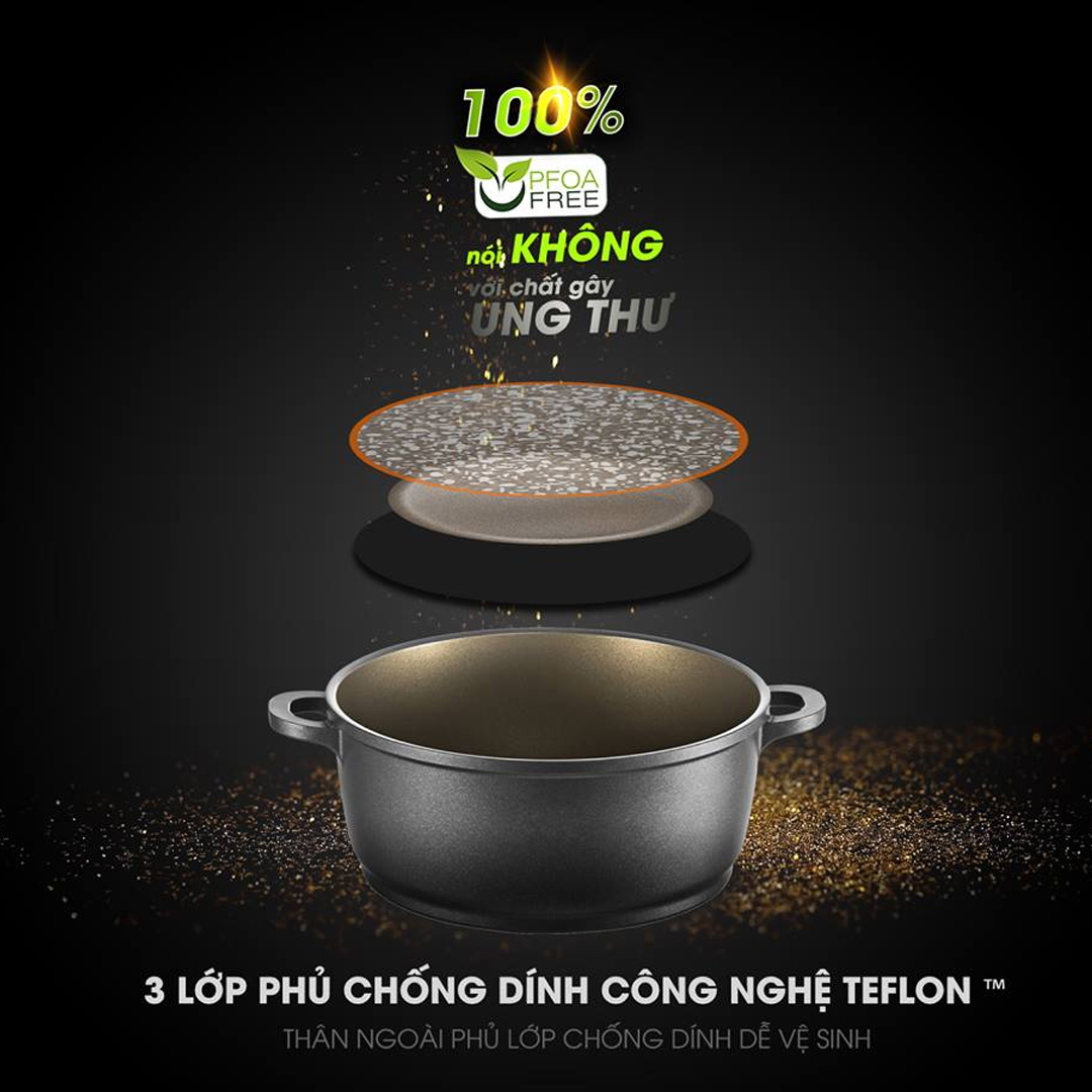 • Lòng chảo phủ 3 lớp chống dính siêu bền, 100% không chứa PFOA, PTFE