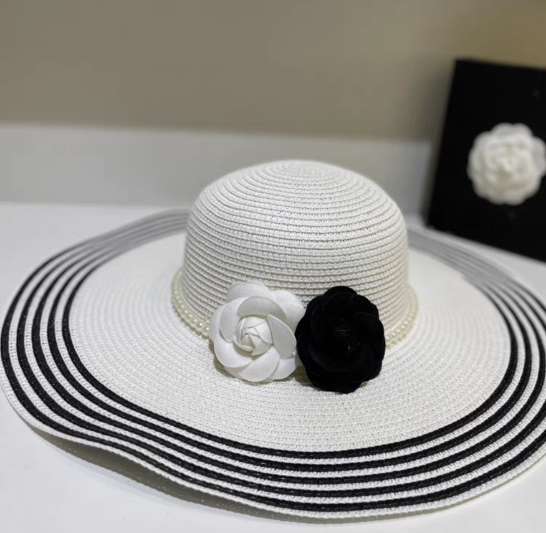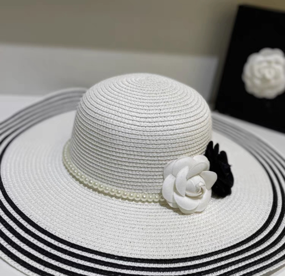 ✨Nón đi biển mũ rộng vành chống nắng viền sọc phối đai ngọc trai nhân tạo 2 hoa trắng đen thời trang Hàn Quốc Chất liệu cói Kiểu dáng vành rộng Nón đi biển mũ vành rộng thời trang du lịch dã ngoại #mudibien dona240901