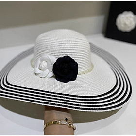 Nón đi biển mũ rộng vành chống nắng viền sọc phối đai ngọc trai nhân tạo 2 hoa trắng đen thời trang Hàn Quốc Chất liệu cói Kiểu dáng vành rộng Nón đi biển mũ