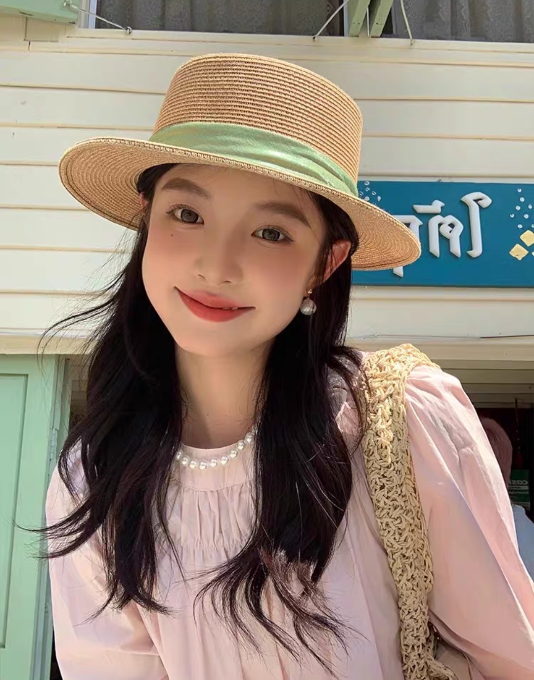 Mũ nón đi biển vành nhỏ chóp bằng phối đai trắng ngọc trai nhân tạo chất liệu cói chống nắng thoáng mát thời trang Hàn Quốc Chất liệu cói Kiểu dáng thời trang chống nắng