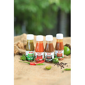 Bộ gia vị ớt Hoàng Gia bao gồm: - Ớt xiêm xanh ngâm giấm tỏi - 200g - Muối tép ớt đỏ - 100g - Muối ớt xanh - 100g - Tương ớt bằm lên