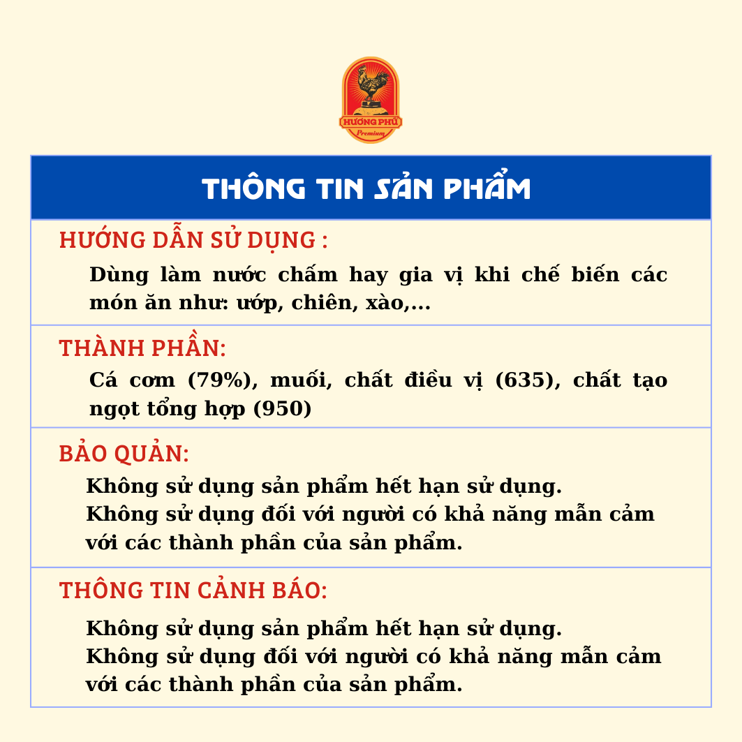 Nước mắm nhĩ cá cơm Hương Phú 40 độ đạm 510ml - truyền thống, thơm ngon chuẩn vị, loại đặc biệt THÔNG TIN SẢN PHẨM - Trọng lượng gói hàng: 510gr - Chai thuỷ tinh: