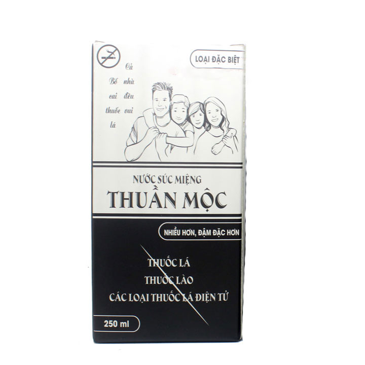 HÃY DỪNG LẠI TRƯỚC KHI QUÁ MUỘN Đừng để thói quen nhỏ ảnh hưởng cả 1 thế hệ Đừng ích kỷ - Đừng nghĩ tôi hút thuốc thì mình tôi chịu. Hãy nghỉ tới những người thân, con trẻ, những em bé còn chưa chào đời. Vì một gia đình hạnh phúc, một cộng đồng khỏe mạnh không khói thuốc Nước súc miệng Thuần Mộc 250ml Thành phần: Bồ công anh, kim ngân hoa, cúc hoa, quế nhục, cam thảo, đại hồi, cồn 35 độ Công dụng: Làm sạch miệng, khử mùi hôi miệng do: hút thuốc lá, thuốc lào, sâu răng, viêm lợ Góp phần ngăn ngừa: Vi khuẩn gây hôi miệng, sâu răng, mảng bám, cho hơi thở thơm mát Làm giảm cảm giác thèm thuốc lá, hỗ trợ việc cai thuốc lá Đối tượng sử dụng: Người  bị sâu răng, hôi miệng, và cần làm sạch khoang miệng Người nghiện thuốc lá, thuốc lào, thuốc lá điện tử Cách dùng: Ngậm 30ml nước súc miệng trong 1-2 phút. Súc kỷ rồi nhổ đi ( không súc lại bằng nước khác ), Dùng liên tục trong một tuần đến khi không còn cảm giác thèm thuô'c lá nữa Lưu ý: Trong thời gian dùng sản phẩm không được hút thuôc, hạn chế uống rưou bia và sử dụng các đồ kích thích. Giữ trạng thái tinh thần thoải mái, không lo lắng căng thẳng để tránh hút thuôc trở lại.