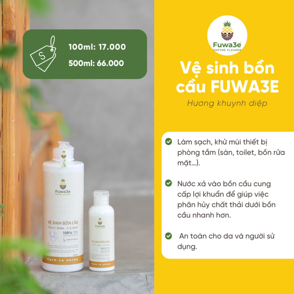 Mua tại Tiktok- Thông tin Nước tẩy bồn cầu Fuwa3e hữu cơ diệt khuẩn với tinh chất khuynh diệp 100ml Gel tẩy rửa vệ sinh bồn cầu vẫn đáp ứng được yêu cầu tẩy sạch mà lại đảm bảo được sức khỏe của bạn, gia đình bạn. Và hơn thế nữa, gel vệ sinh bồn cầu được làm từ các Enzyme sinh học, không chứa hóa dầu nên không làm hại môi trường, không làm chết vi sinh vật có lợi trong việc phân hủy chất thải. Thành phần Nước tẩy bồn cầu Fuwa3e hữu cơ: