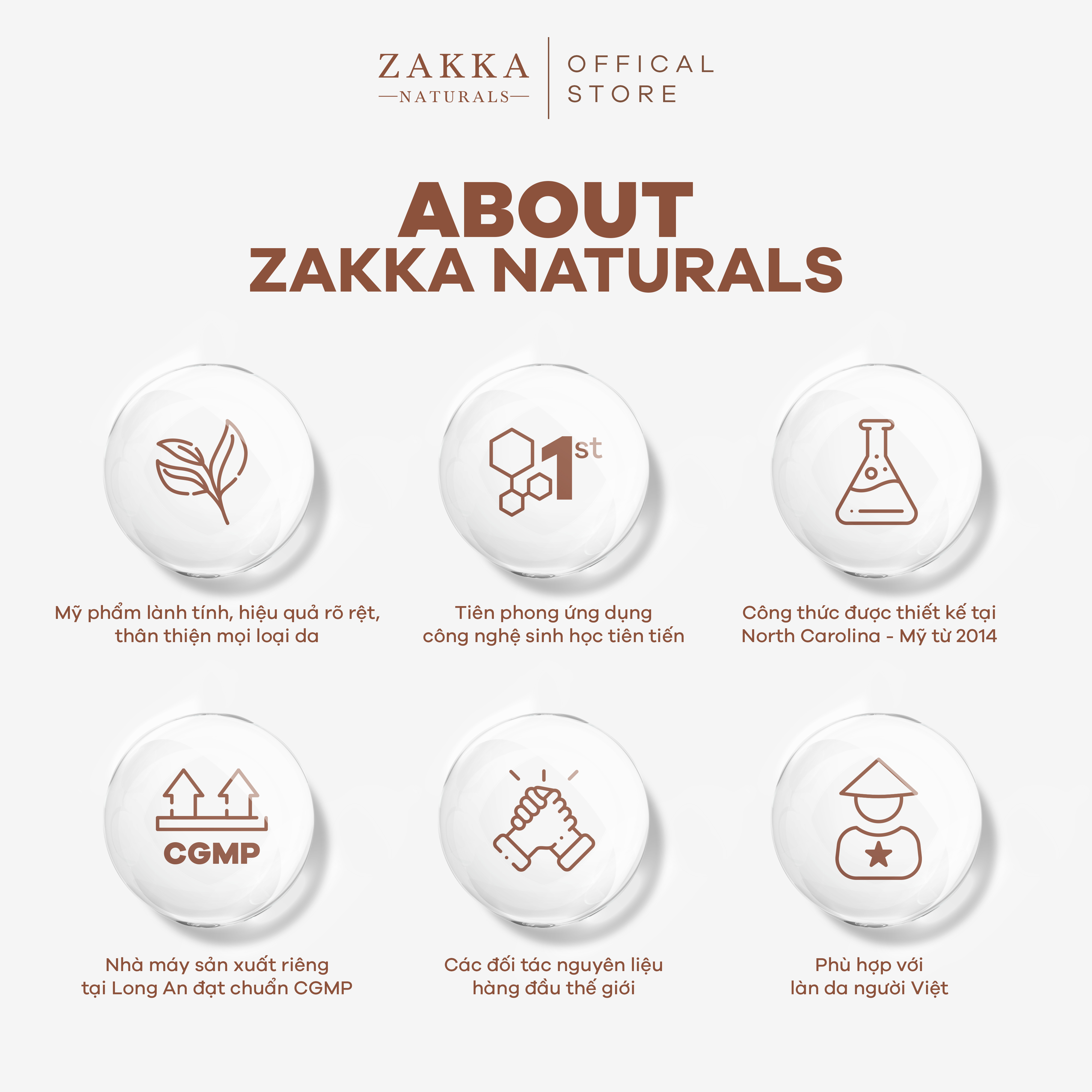 THÔNG TIN THƯƠNG HIỆU: Zakka Naturals là thương hiệu mỹ phẩm ứng dụng công nghệ tiên tiến giúp tối ưu hiệu quả, phù hợp mọi làn da ngay cả da nhạy cảm.