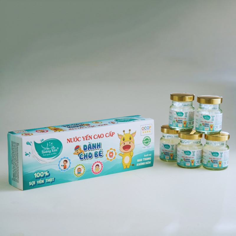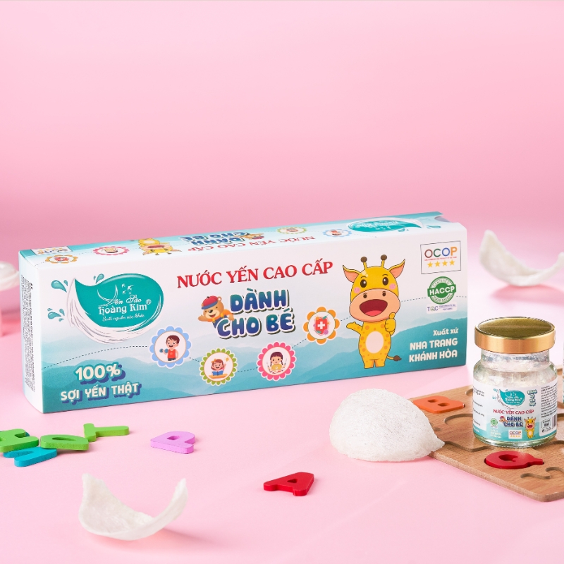 Yến Sào Hoàng Kim - Nền Tảng Vững Chắc Cho Bé Yêu Khôn Lớn, Lựa Chọn An Tâm Của Mẹ Sức khỏe của con là mối quan tâm hàng đầu của cha mẹ. Nước Yến Cao Cấp Dành Cho Bé của Yến Sào Hoàng Kim được bào chế với công thức chuyên biệt, an toàn và lành tính, nhằm mang đến nguồn dinh dưỡng tự nhiên quý giá, hỗ trợ bé phát triển toàn diện trong những năm tháng đầu đời. Điểm Vượt Trội Của Sản Phẩm: -     Công Thức An Toàn, Chuyên Biệt Cho Bé: Hàm lượng yến sào (0.5g) được nghiên cứu để phù hợp với hệ tiêu hóa và khả năng hấp thu của trẻ. Công thức không chứa gừng, có vị ngọt dịu và hương thơm lá dứa tự nhiên giúp bé uống ngon miệng. ️-     An Toàn Tuyệt Đối - Cam Kết 3 KHÔNG: Sản phẩm cam kết Không chất bảo quản, Không hương liệu nhân tạo, Không phẩm màu, đảm bảo sự tinh khiết và an toàn nhất cho sức khỏe của bé. -     Chất Lượng Được Nhà Nước Bảo Chứng (OCOP 4 Sao): Sản phẩm đạt chứng nhận OCOP 4 sao của tỉnh Khánh Hòa năm 2024. Đây là sự bảo chứng uy tín về chất lượng và nguồn gốc mà cha mẹ có thể hoàn toàn tin tưởng. -     Sản Xuất Theo Tiêu Chuẩn Quốc Tế HACCP: Quy trình sản xuất nghiêm ngặt theo chuẩn HACCP, đảm bảo vệ sinh an toàn thực phẩm ở mức cao nhất, mang lại sự an tâm tuyệt đối cho mẹ khi chọn sản phẩm cho con. Thông Tin Chi Tiết Sản Phẩm: Thương hiệu: Yến Sào Hoàng Kim Xuất xứ: Việt Nam Thành phần: Nước (68g), yến sào nguyên chất (0.5g yến khô, tương đương 4.2g yến tươi), đường phèn (6.5g), lá dứa tươi. Đối tượng sử dụng: Được thiết kế dành riêng cho trẻ nhỏ cần phát triển toàn diện. Hướng dẫn sử dụng: Lắc đều trước khi cho bé uống, ngon hơn khi uống lạnh. Là bữa phụ dinh dưỡng tuyệt vời cho bé. Hạn sử dụng: 12 tháng.