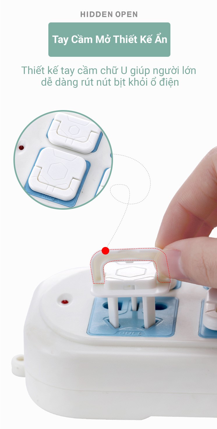 - Bịt ổ điên có chốt khóa quai để các bé không cầm được quai kéo ra, đồng thời giúp người lớn thao tác dễ dàng khi cần để tháo ra.