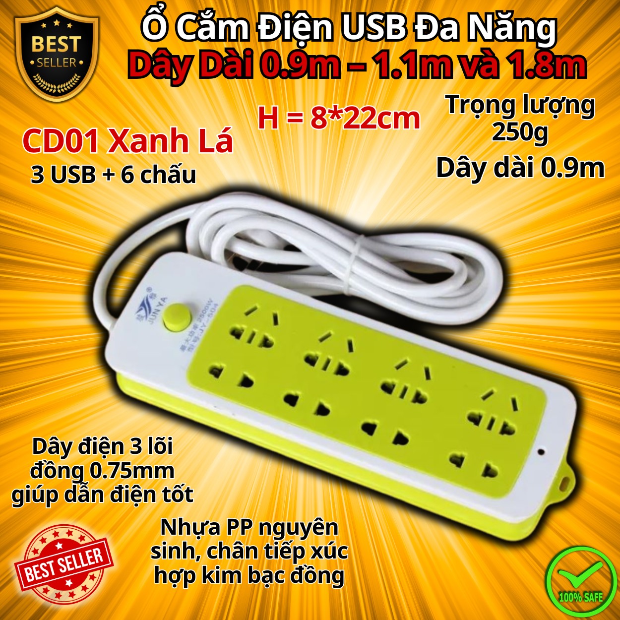 Ổ Cắm Điện USB Đa Năng Cao Cấp Chống Giật Dây Dài 0.9m – 1.1m và 1.8mỔ Cắm Điện Công Suất 2500WCó Chốt An Toàn Tiện Lợi, Chính Hãng ✅ Mã ổ cắm CD01 – dây 0.9m – màu xanh lá✅ Mã ổ cắm CD02 Trắng 7...