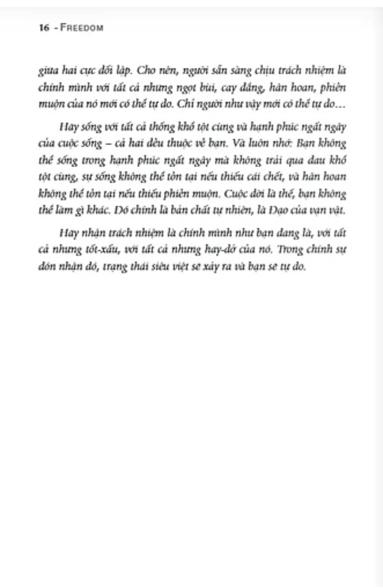 Với những chia sẻ đầy khai mở, cuốn sách “Tự do – Như chim tung cánh” giúp người đọc xác định những trở ngại đối với tự do của họ, có thể do hoàn cảnh hoặc do bản thân họ tự áp đặt, tìm thấy lòng dũng cảm để thành thật với chính mình. Và hãy lắng nghe lời Osho nhắn nhủ chúng ta: “Hãy sống với tất cả thống khổ tột cùng và hạnh phúc ngất ngây của cuộc sống – cả hai đều thuộc về bạn. Và luôn nhớ: Bạn không thể sống trong hạnh phúc ngất ngây mà không trải qua đau khổ tột cùng, sự sống không thể tồn tại nếu thiếu cái chết, và hân hoan không thể tồn tại nếu thiếu phiền muộn. Cuộc đời là thế, bạn không thể làm gì khác”.