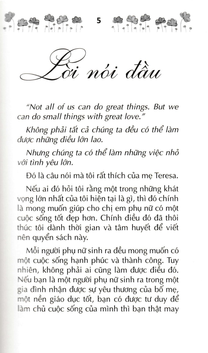 Mua tại TiktokPhẩm Cách Cao Quý - Bản Lĩnh Nữ Hoàng - 30 Nguyên Tắc Vàng Của Phụ Nữ Hạnh Phúc (Sbooks) "Not all of us can do great things. But we can do small things with great love." Không phải tất cả chúng ta đều có thể làm được những điều lớn lao. Nhưng chúng ta có thể làm những việc nhỏ với tình yêu lớn. Đó là câu nói mà tôi rất thích của mẹ Teresa. Nếu ai đó hỏi tôi rằng một trong những khát vọng lớn nhất của tôi hiện tại là gì, thì đó chính là mong muốn giúp cho chị em phụ nữ có một cuộc sống tốt đẹp hơn. Chính điều đó đã thôi thúc tôi dành thời gian và tâm huyết để viết nên quyển sách này.