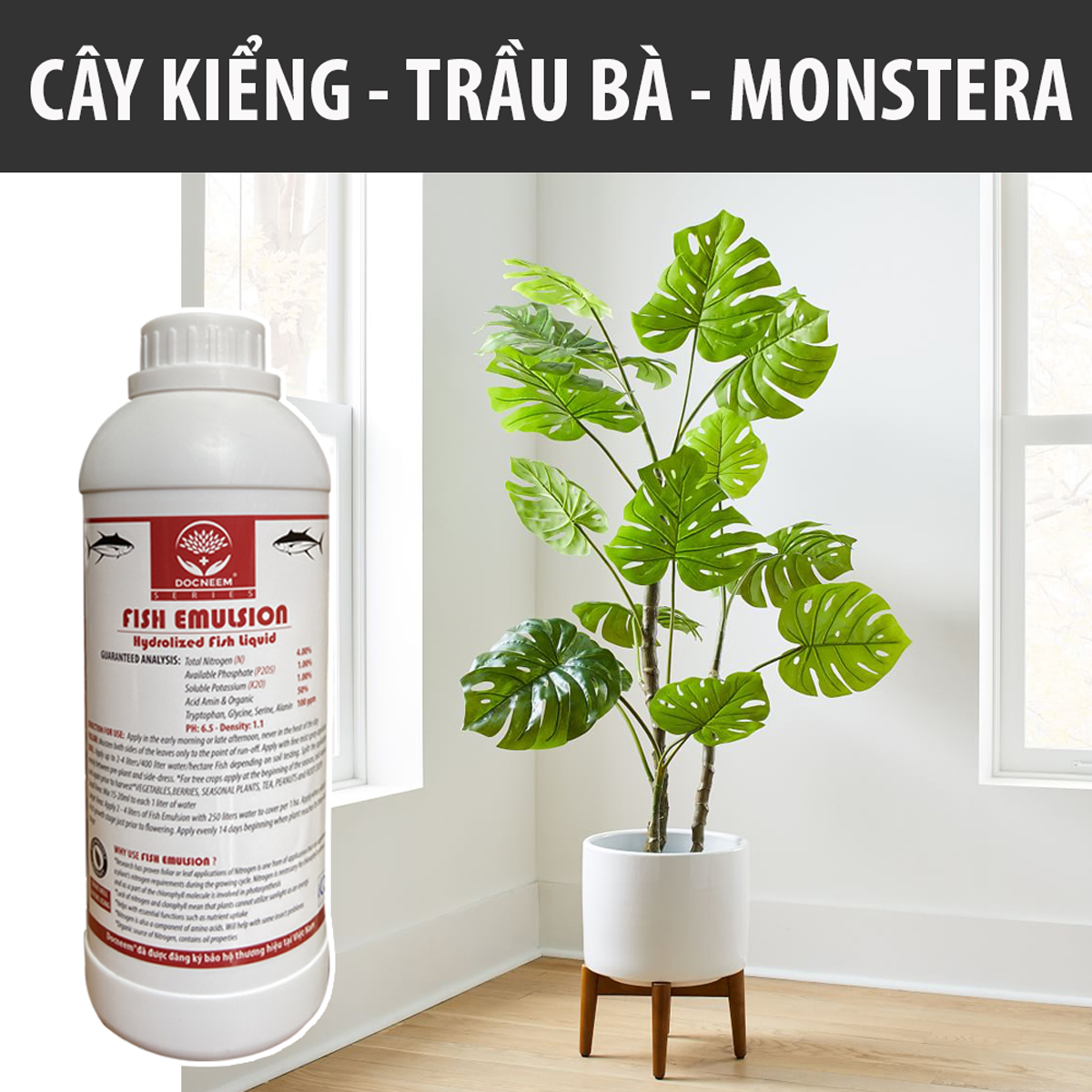 - Thương hiệu DOCNEEM được bảo hộ tại Cục sở hữu trí tuệ Việt Nam Dinh dưỡng tối ưu cho tất cả các loại cây: Rau sạch, Cây cảnh, Hoa hồng, Cây trong nhà và ngoài trời THÀNH PHẦN: N (4%), P2O5 (1%), K2O (1%), Acid amin hữu cơ (50%), PH: 6.5, Tỷ trọng 1.1 CÔNG DỤNG: FISH EMULSION là phân bón sinh học SIAMB 14 hữu cơ bón qua lá hoặc bón gốc tinh khiết đậm đặc, được chiết xuất từ cá Mòi biển nguyên con bằng phương pháp thủy phân lấy từ vùng biển lạnh, đặc biệt bổ sung hữu cơ trung vi lượng Cl, Na, Ca, Mg, S và các acid amin Tryptophan, Glycine, Serine, Alanin giúp cây hấp thụ tức thì chất đạm hữu cơ. Cây lớn nhanh, lá xanh dày. Tăng năng suất và chất lượng sản phẩm sau thu hoạch. Tăng chất đề kháng thích ứng với đất bị pha cát, bạc màu. CÁCH SỬ DỤNG: Dùng cho tất cả các loại cây trồng, theo từng giai đoạn phát triển của cây.