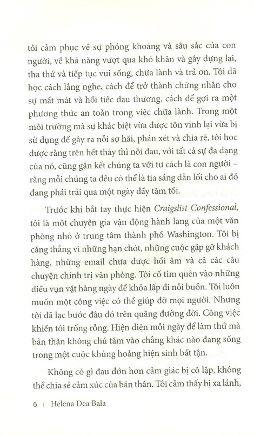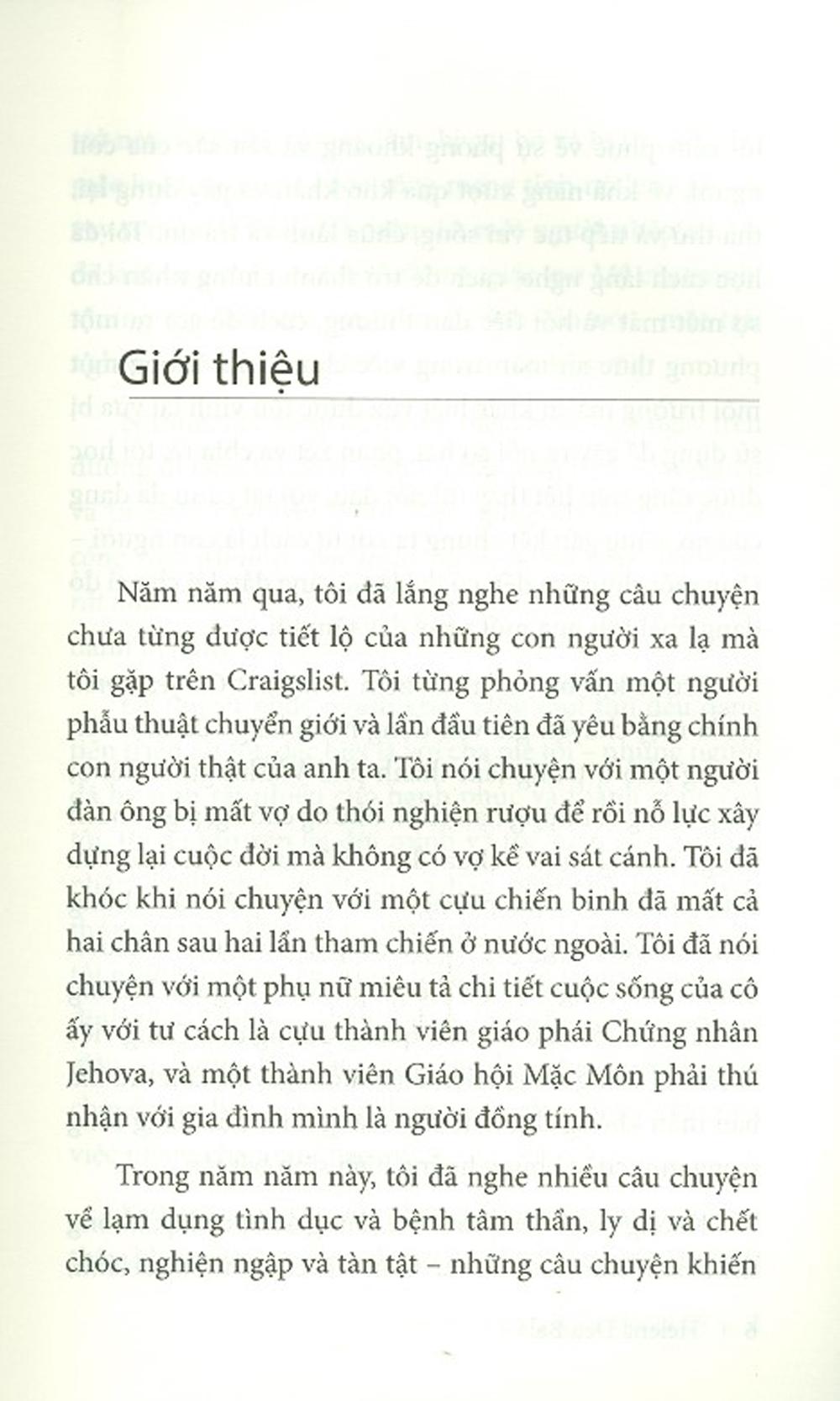 Mua tại Tiktok" Năm năm qua, tôi đã được nghe rất nhiều bí mật của những người xa lạ mà tôi gặp trên Craigslist. Những câu chuyện về lạm dụng tình dục và rối loạn tâm thần, chia ly và cái chết, nghiện ngập và tàn tật, khiến tôi cảm phục về sự phóng khoáng sâu sắc của con người, về khả năng vượt qua khó khăn và tiến bước, chữa lành và trả ơn. Tôi học được cách lắng nghe, cách trở thành chứng nhân cho sự mất mát và hối tiếc đau thương, cách đưa ra phương thức an toàn để chữa lành. Ở nơi sự khác biệt vừa được tôn vinh lại vừa bị lợi dụng để gây sợ hãi và chia rẽ, tôi nhận ra rằng nỗi đau, trong bất cứ hình hài nào, cũng có thể gắn kết con người với nhau .
