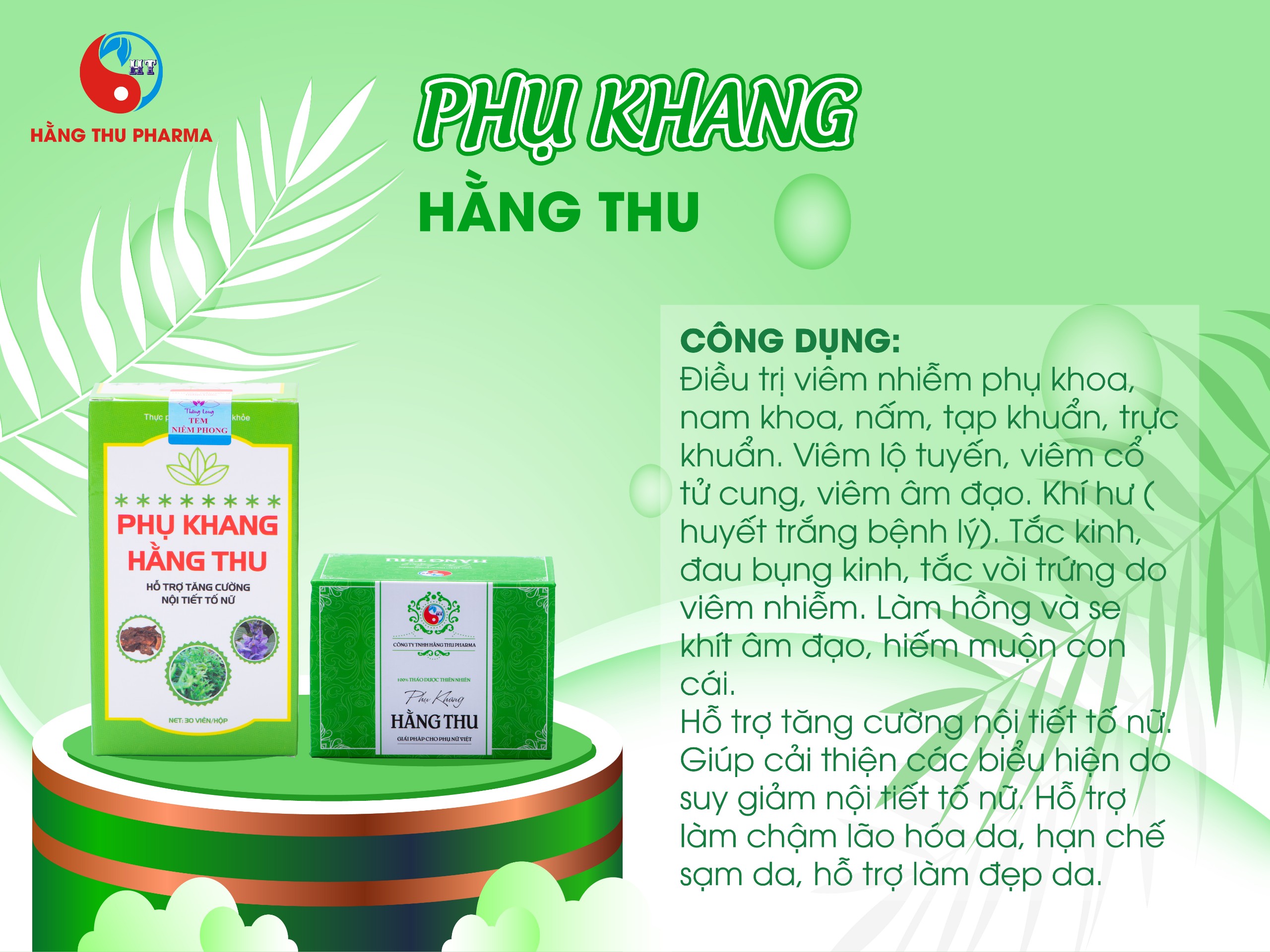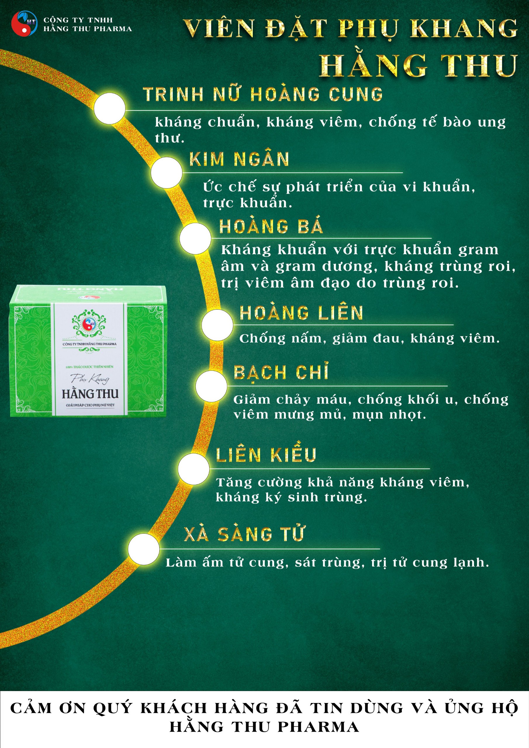 - Thuốc có tác dụng ức chế đối với tụ cầu khuẩn vàng nhờn thuốc, trực khuẩn mủ xanh, trùng roi và một số loại nấm gây lở ngứa,… Đối tượng sử dụng: phụ nữ bị viêm nhiễm. Phụ nữ có nhu cầu tân trang, làm đẹp cô bé Cách dùng viên đặt Phụ Khang Hằng Thu: 2 ngày đặt 1 viên và sau lấy ra đặt viên tiếp theo Công Dụng Thành Phần Của Viên Uống Phụ Khang (Được Tặng Kèm Khi Mua Viên Đặt Phụ Khang Hằng Thu) Thành phần: