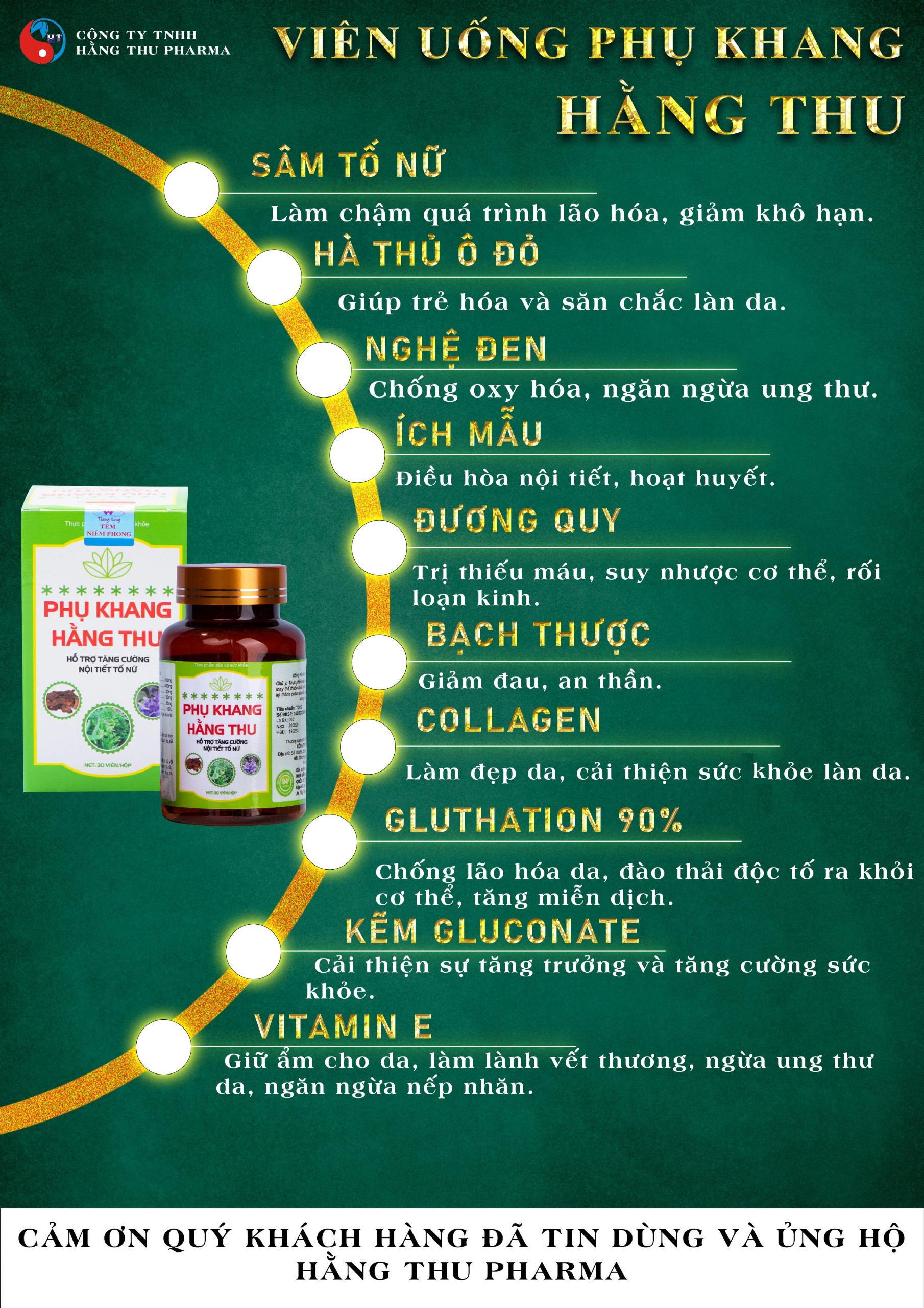 - Vitamin e: giữ ẩm cho da, làm lành vết thương, hỗ trợ ngừa ung thư da, nếp nhăn. Đối tượng sử dụng Viên uống Phụ Khang Hằng Thu: Phụ nữ tiền mãn kinh, suy giảm nội tiết. Người bị lão hóa da, sạm da, khô da. Cách dùng: ngày uống 2 – 3 viên. Ngày uống 2 – 3 lần, sau khi ăn 30 phút – 1 tiếng