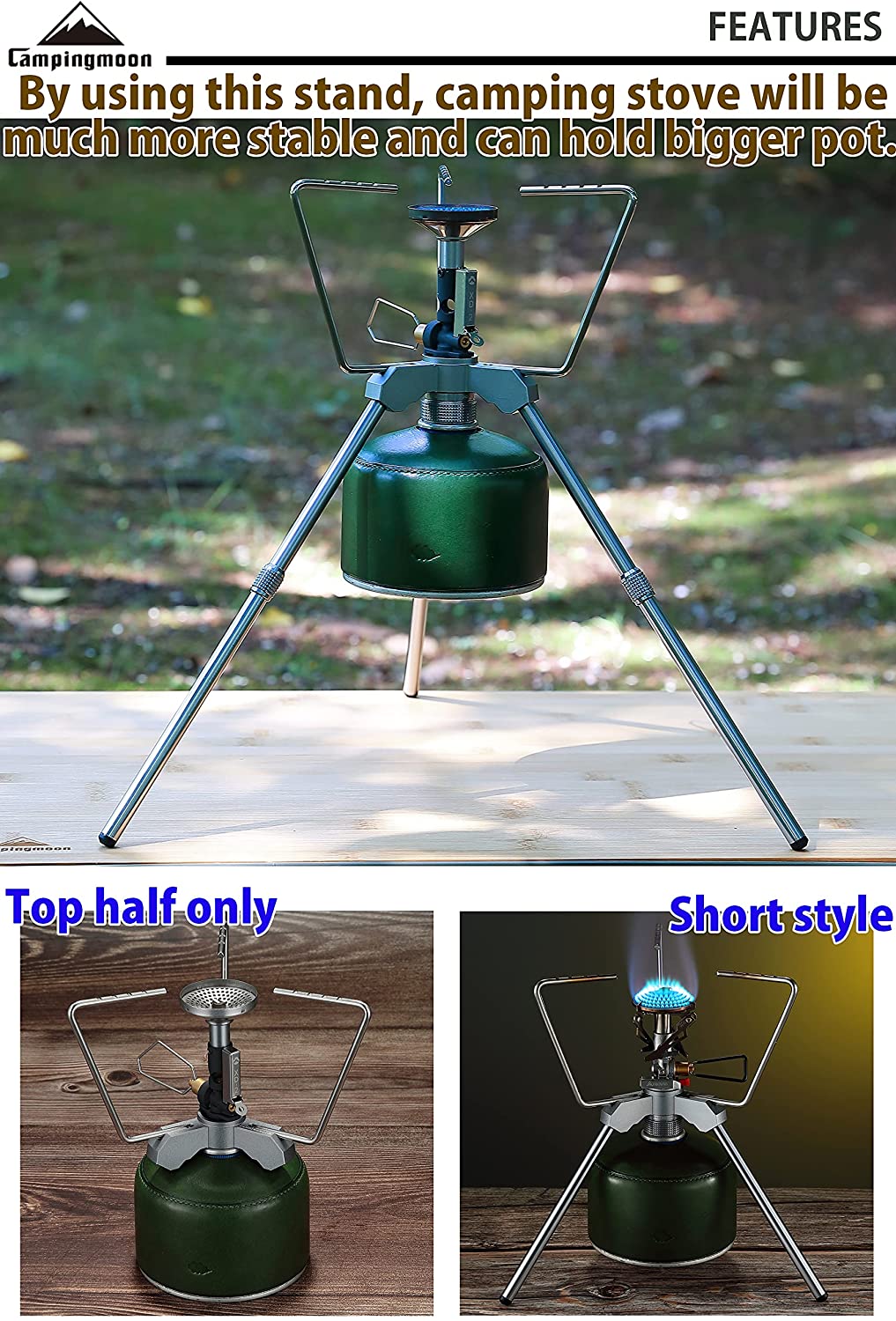 Phụ kiện chân đế khung bếp gas mở rộng Campingmoon Z01 hỗ trợ các bếp ngoài trời và mặt bàn cắm trại, dã ngoại. Phần đỡ lớn phía trên (phần trivet) mang lại sự hỗ trợ chắc chắn cho chiếc nồi lớn và ổn định ngay cả trên địa hình gồ ghề như leo núi và vùng nhiều đá.