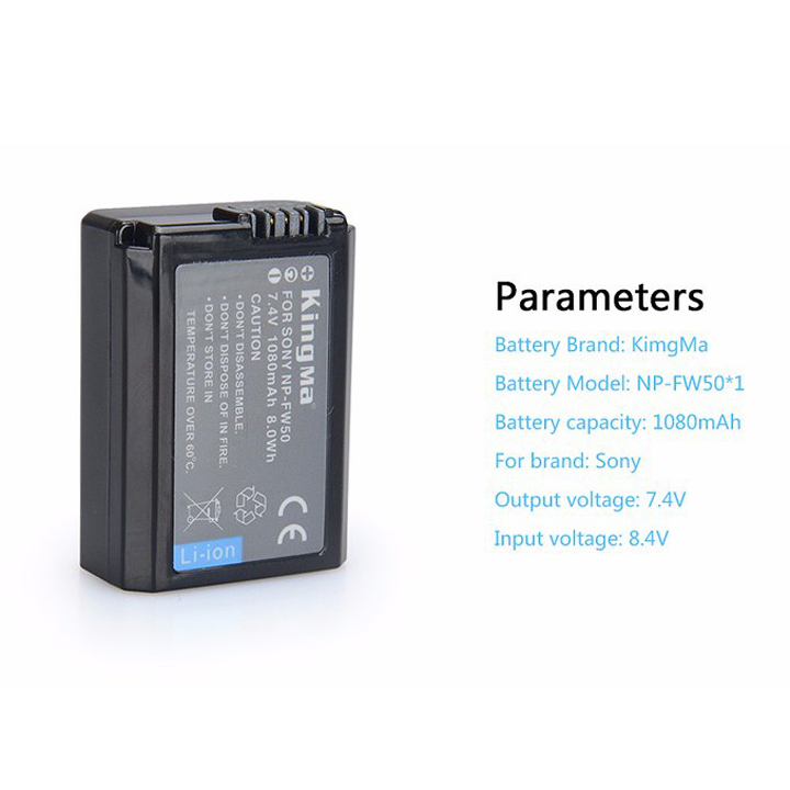 Pin máy ảnh Kingma cho Sony NP-FW50 Thông tin sản phẩm: Pin Kingma for Sony NP-FW50 -Model: NP-FW50; -Điện áp 7.4V; -Công suất: 1080mAh 8.0Wh; -Loại pin: Pin Li-ion; -Kích thước: 45 * 31,9 *