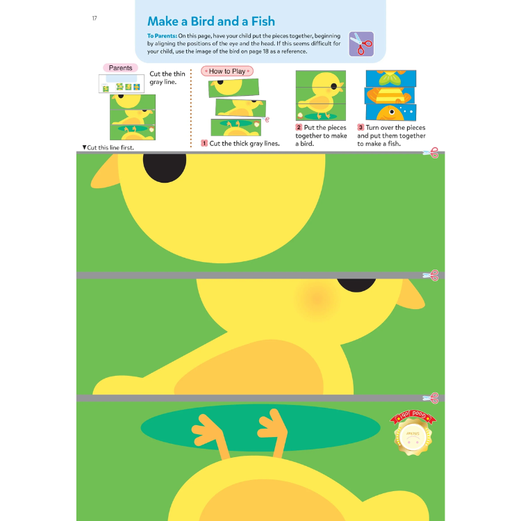 Play Smart Cutting and Pasting 3+ is a book designed for children aged 3 and up, focusing on developing cutting, pasting, and fine motor skills. The book includes various engaging games and challenges such as cutting lines and shapes, labeling, using stickers, solving mazes, and counting. These activities are designed to help children get familiar with scissor skills and strengthen their fine motor abilities, thereby making them more confident and independent as they prepare for kindergarten.